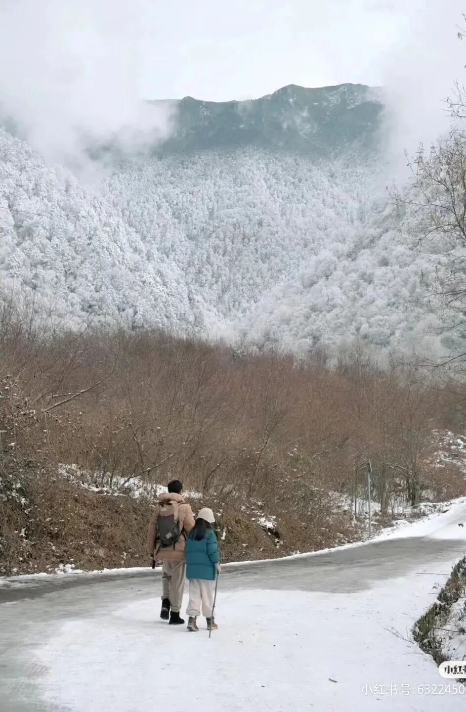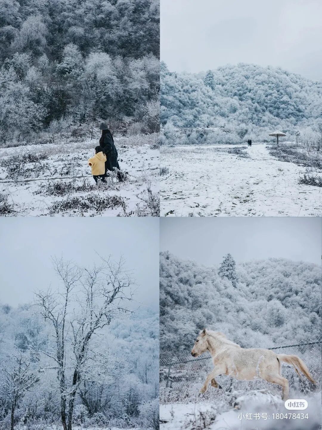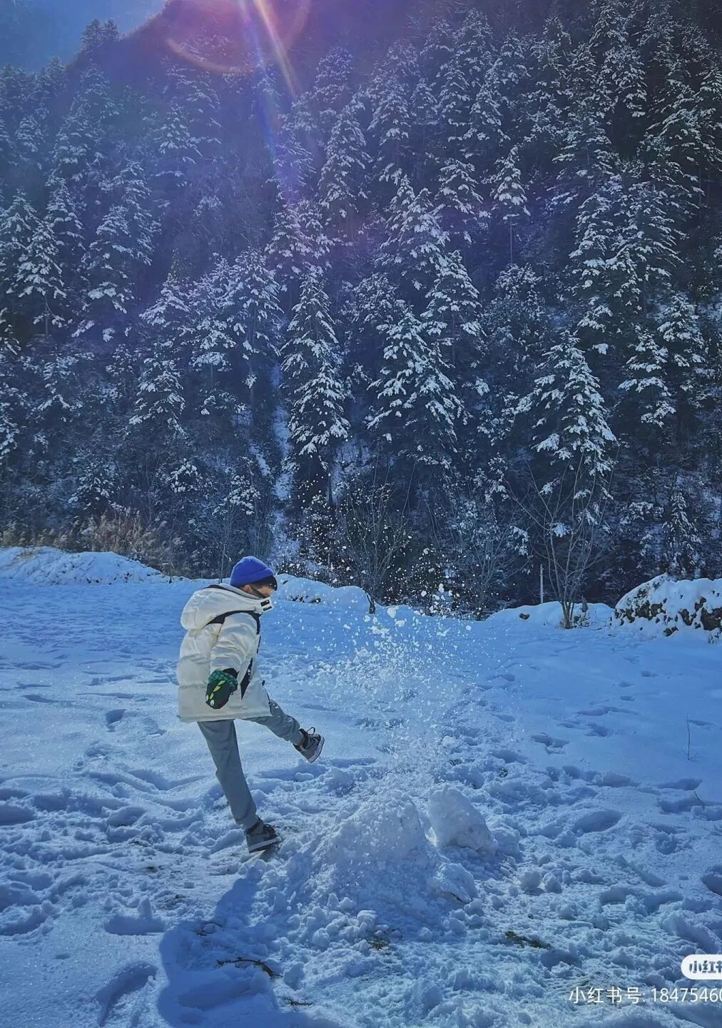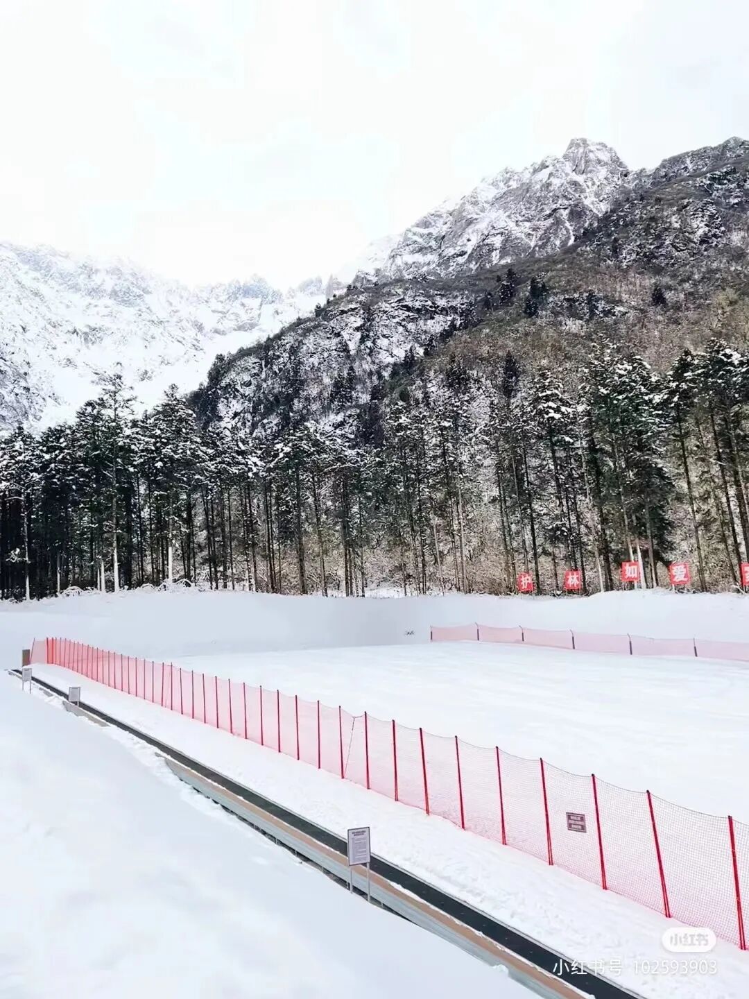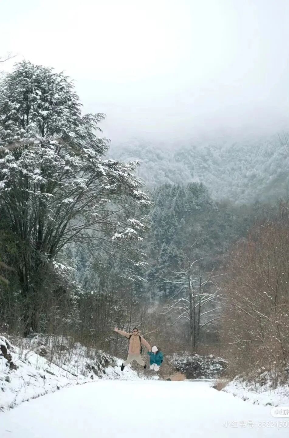 图源小红书:殷小殷全程基本0难度的徒步路线,平坦的水泥路面,厚雪覆盖时,就形成了天然的滑行道,带上滑雪板就能敞耍!以上皆是耍家元旦的实拍,当地人说,1月中旬这里的积雪会更厚!对了,黄草坪位于熊猫核心保护区,旁边就是卧龙熊猫基地。亲子家庭早上可以带娃娃看熊猫,下午耍雪赏美景,周末轻松一日游,简直不要太安逸~出行tips