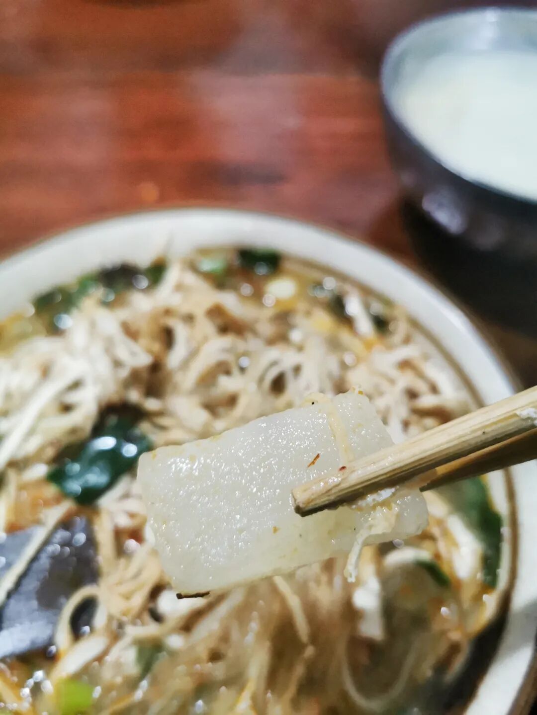 挑起一大筷,炸豆腐丝的韧感还在牙齿间炫耀,香气已经灌入喉头,这香气是层层叠叠的:石磨土豆腐天然的豆香中浸出油炸后温润的香,连同着高汤里大料卖力的香,最后是羊油辣椒带着微膻的香,直香得人鼻尖额头都冒汗却又顾不得腾出手抹掉。