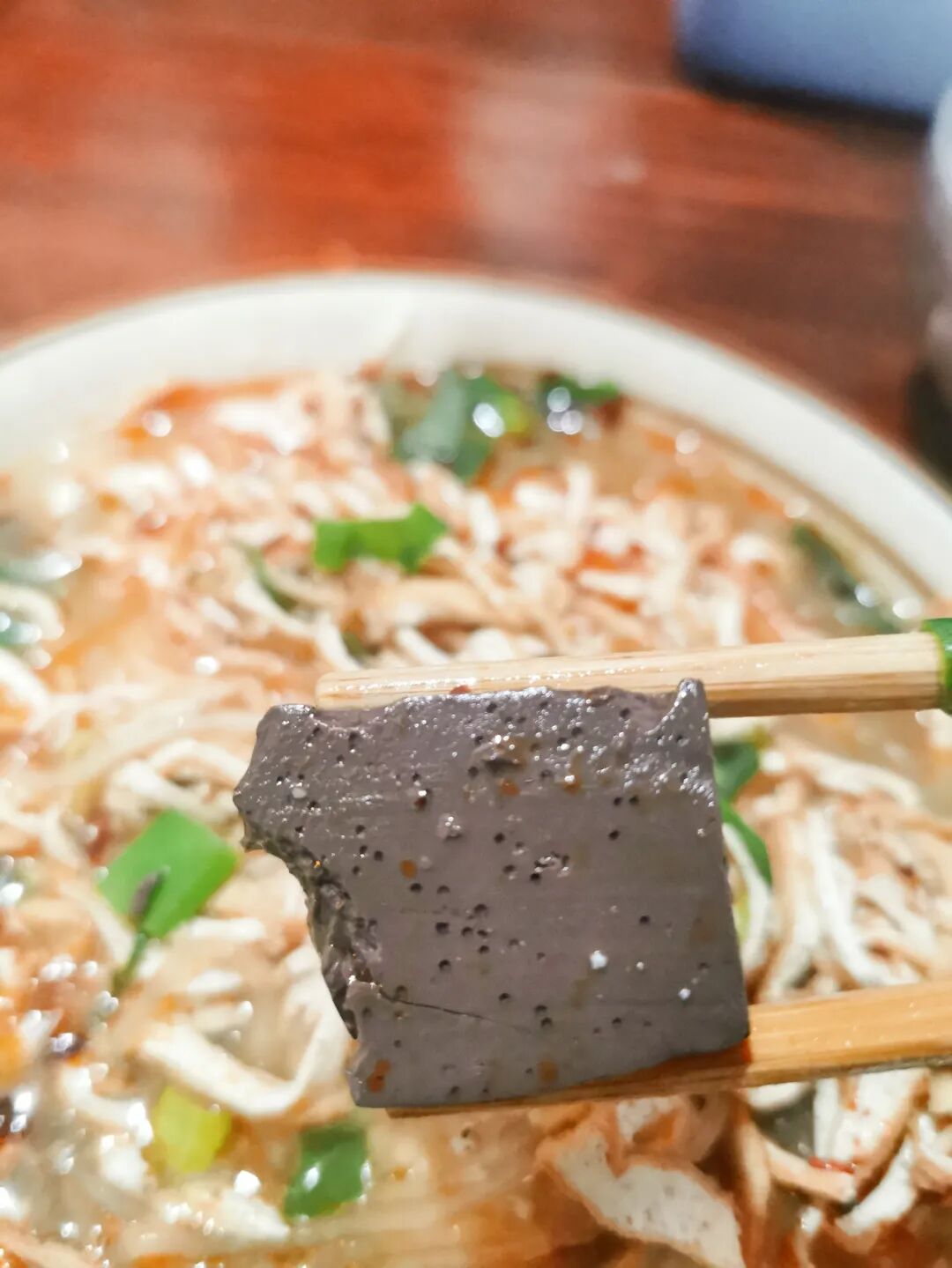 耐煮的粉条先入汤,再放入经高汤煨过的萝卜块和滑嫩的羊血,待粉条断了生,放入豆腐丝同煮,片刻后即可用碗下锅盛出,再放入点睛的羊油辣椒,撒上提味的葱花与味精,这个不知道流传多少辈的豆腐菜便成了。
