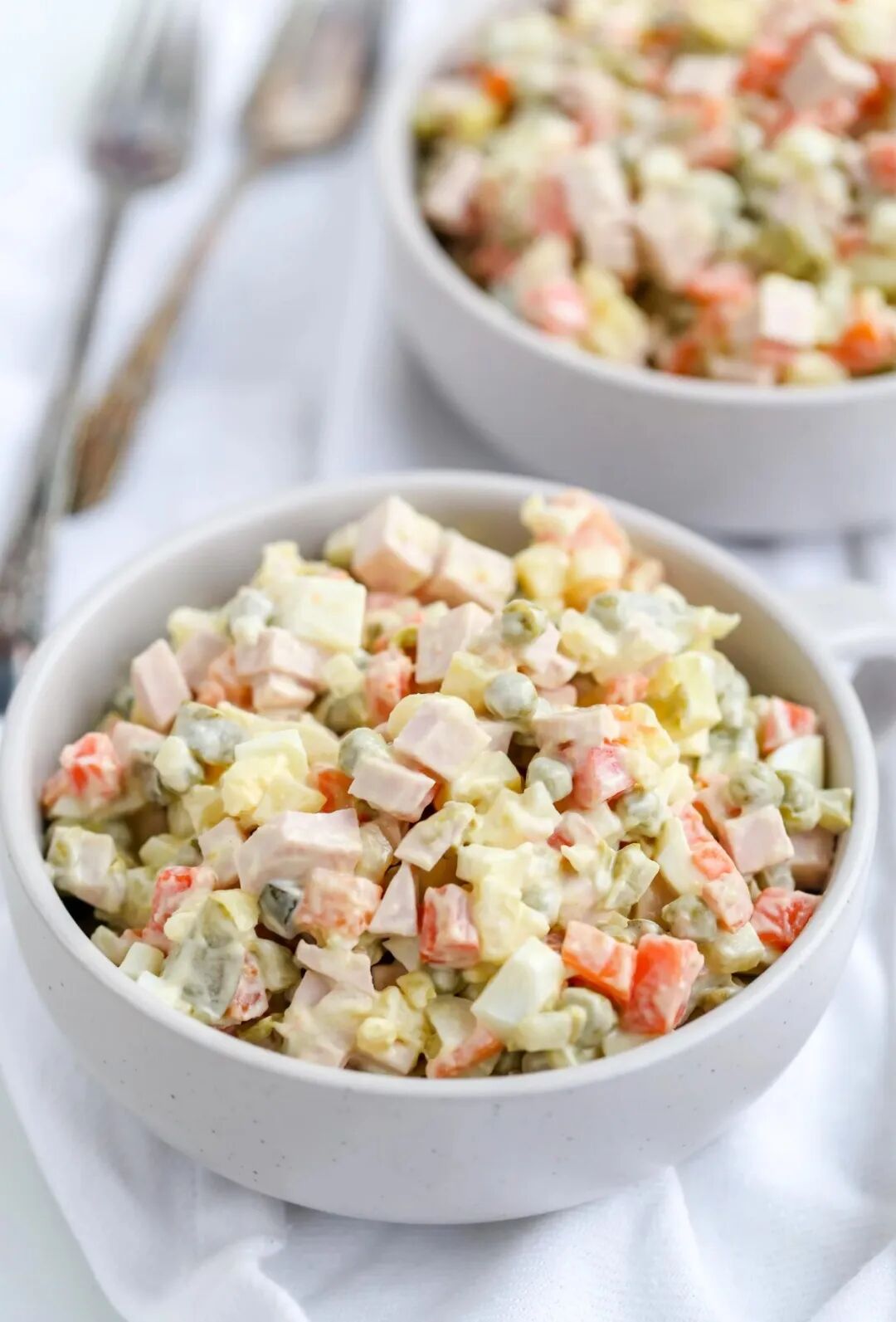 土豆火腿酸黄瓜胡萝卜豌豆,配上美乃滋,就是今天的“俄式沙拉”