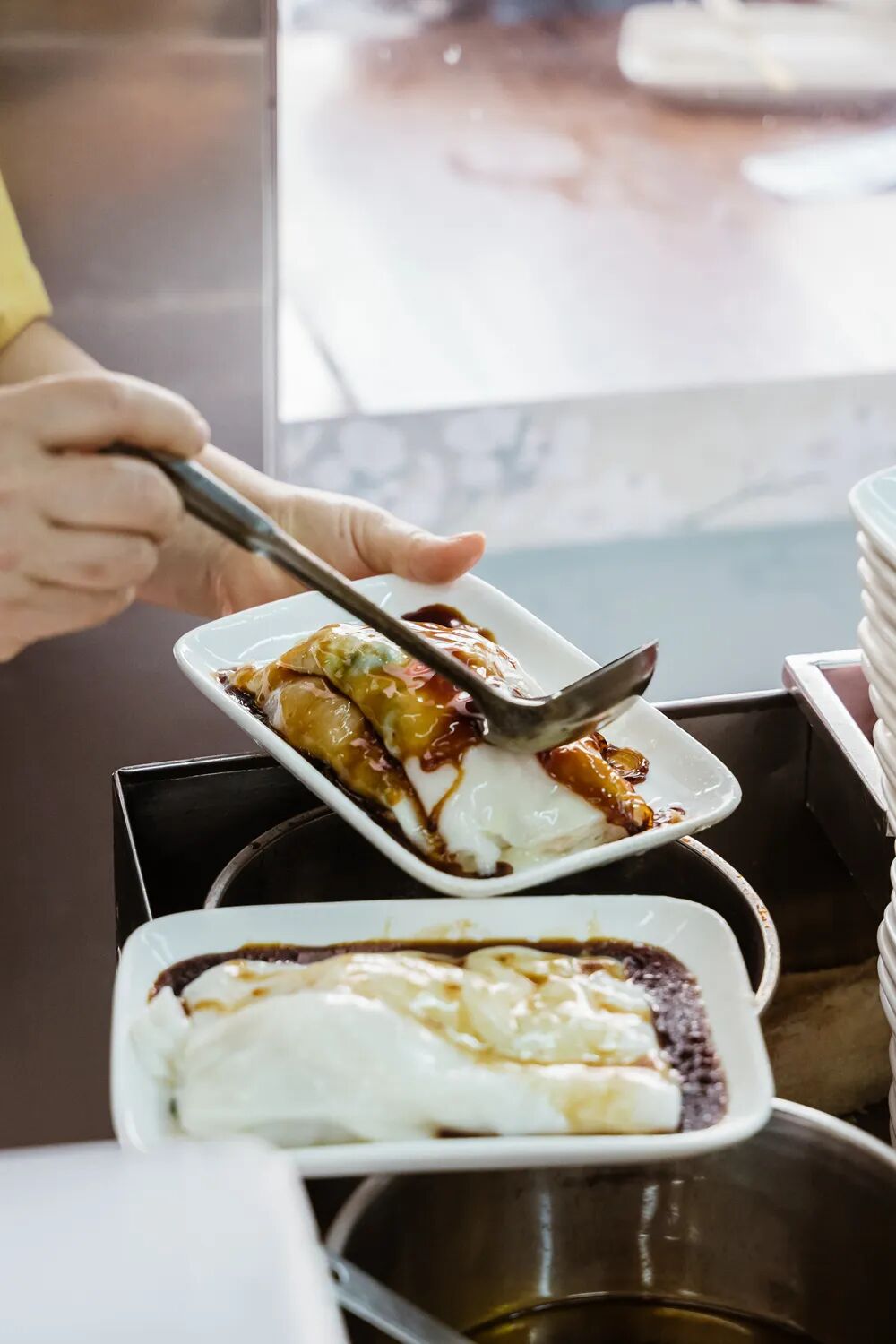 粤人则想出了“竹升面”的法子,一根竹子作为杠杆,以人力,将不放水,只以蛋类和面的面团压紧、压实,再切成面条。这是手擀面的升级版,虽然面粉筋力不够,但禽蛋的加入一定程度上补充了面团中的蛋白质,并且通过物理方法提高面食致密程度的方式,依然能让面条获得弹牙的口感。面食的起酥是又一项伟大的发明。虽然酥皮并非中国人原创,但在面团里混入油脂并烘烤的烹饪方式,很大程度上拯救了南方筋力不足的面粉——筋力越低的面粉,在起酥后越能获得松脆掉渣的口感。这就是各种酥饼、酥点、酥皮、掉渣烧饼,能在南方更加流行的原因。包括虾饺、肠粉在内的混合面食,则是一种有趣的尝试。把面粉与米粉按照一定比例混合,甚至加入一些豆类、块根的淀粉,这样擀出的面皮外观晶莹剔透,口感在软糯、筋道与爽滑中找到了平衡。其实日式和果子中,用糯米粉和玉米粉混合制成的大福,有异曲同工之妙。![]()