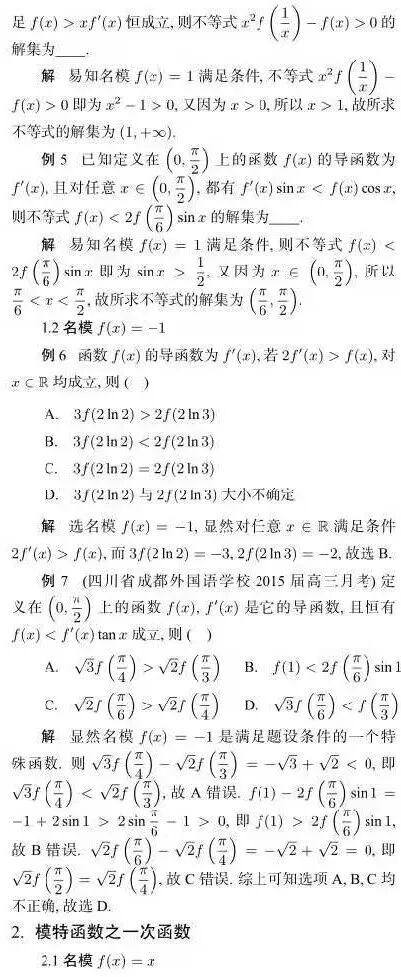 在高考和模拟考中, 有这样一类抽象函数难题频频亮相,成为高中数学的热点和难点问题. 题目已知某抽象函数及其导函数满足若干个不等式或等式, 要求比较相关式子的大小或求解有关的不等式. 这类问题多以客观题的形式出现, 命题意图主要考查运用导函数的运算法则构造新的抽象函数,然后运用函数单调性求解. 构造新的抽象函数是解决这类问题的通性通法, 解法严谨、厚重踏实, 但对考生的运算求解、推理论证、构建模型等综合能力的要求较高. 若能找到符合题设条件的一个具体函数, 我们称之类“模特儿函数”简称“特函数”, 于是可用这个“模特儿函数”来代言抽象函数, 这样化抽象为具体可以大大降低试题难度, 使问题得到快速解决有时甚至是“秒杀”. 下面我们以一定数量的典型试题为例, 着重推介五类“模特”四大“名模”在快速解决这类抽象函数问题中的神奇作用, 供复习备考的高三师生参考.