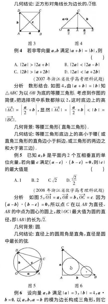 “注重考查数学的本质、注重数学的核心思想方法考查”是浙江省数学高考试题的显著特点之一,这从试题对向量内容的考查可略见一斑. 自2004 年浙江省自主命题以来,每年都有一道向量内容的客观题,入口都较宽,解法多样,其中数形结合的方法往往是最优解. 同时,每道试题的背后都有一个漂亮的几何背景,都对应一个浅显直观的几何结论. 下面以理科试题为例,主要从数形结合的角度做简要解析.