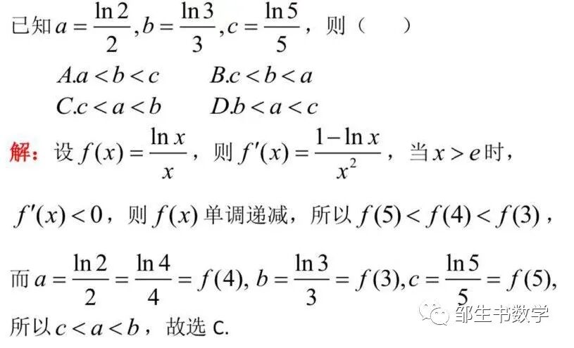 点评:作差比较法和作商比较法只适合两个数式的大小比较,构造函数法是用函数的思想也就是整体的思想,将需要比较的两个或两个以上的量放到某个函数的单调区间上加以比较。整体思想和各个击破的策略并不孤立的,关键是用得恰到好处,有时同一个问题的解决中既要用到整体思想又要用到各个击破的策略,请看下面的解法4.