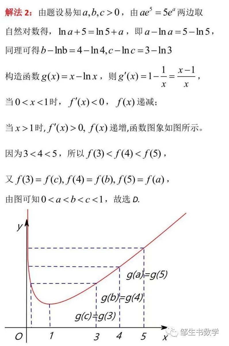 小结:比较上述5种解法可知,解法3构造函数法,用函数的单调性可以将三个数式的大小比较一步到位;作差比较法和作商比较法,根据选项设置特点也要作两次比较;解法4和解法5,将对数式转化为指数式或根式比较大小,显得迂回曲折舍近求远。