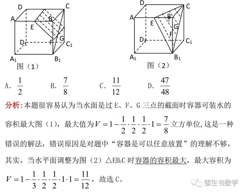 例2.有一容积为1 立方单位的正方体容器ABCD-A1B1C1D1,在棱AB、BB1及对角线B1C的中点各有一小孔E、F、G,若此容器可以任意放置,则该容器可装水的最大容积是( )