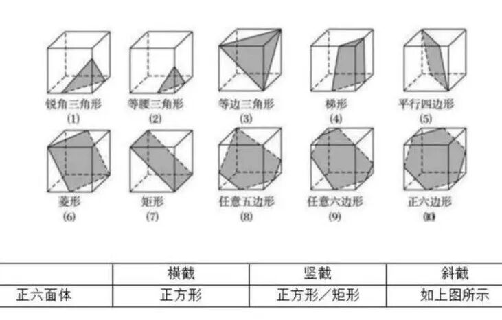 正六面体斜截面是不会出现以下几种图形:直角三角形、钝角三角形、直角梯形、正五边形。