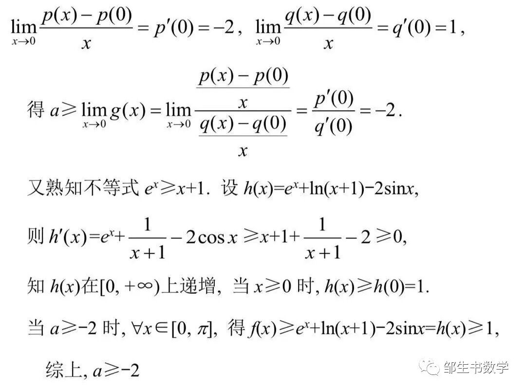 (注:此解法中采用先必要后充分的方法, 其中h(x)是a=-2时的f(x), 对导数与原函数分别作了适当的放缩)