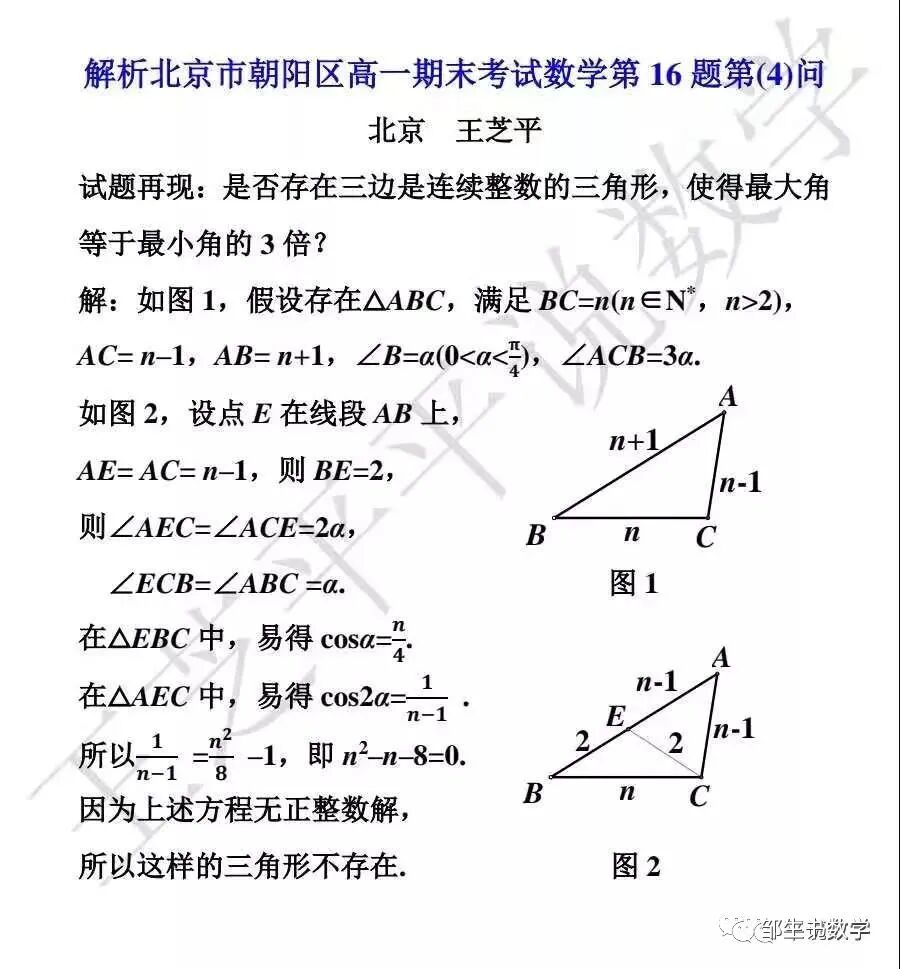 北京王芝平老师在公众号《平说数学》20210705的推文中,对上述朝阳区高一期末考试数学第16题第④问,给出了:巧构造等腰三角形,妙用二倍角余弦公式的漂亮解法,解法如下: