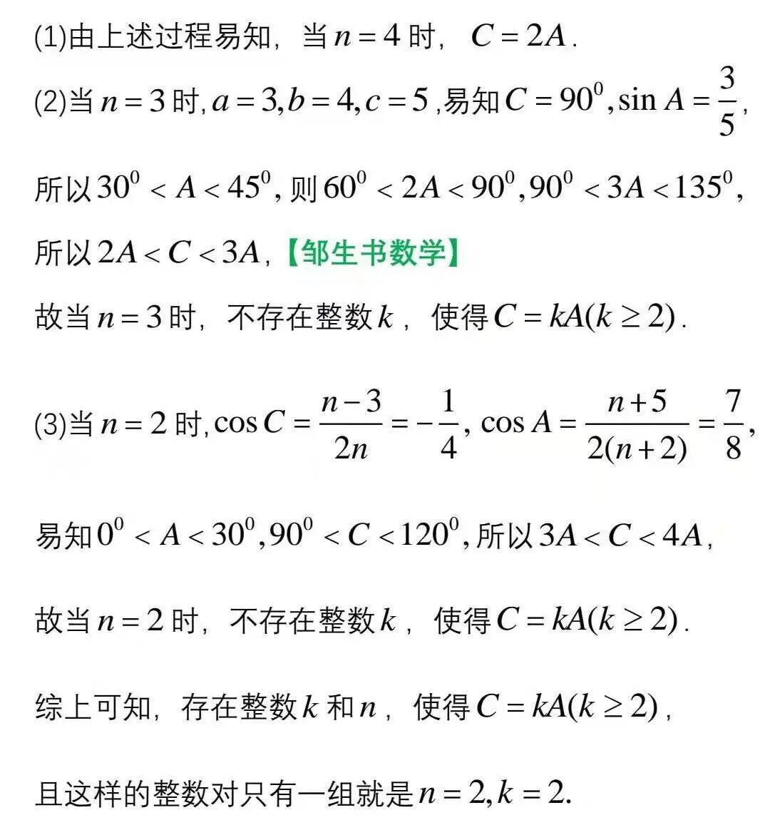 在△ABC中,a=n,b=n+1,c=n+2(n≥2,n∈N*),是否存在整数k和n,使得C=kA(k≥2)?若存在求出所有k和对应n的值;若不存在,请说明理由。