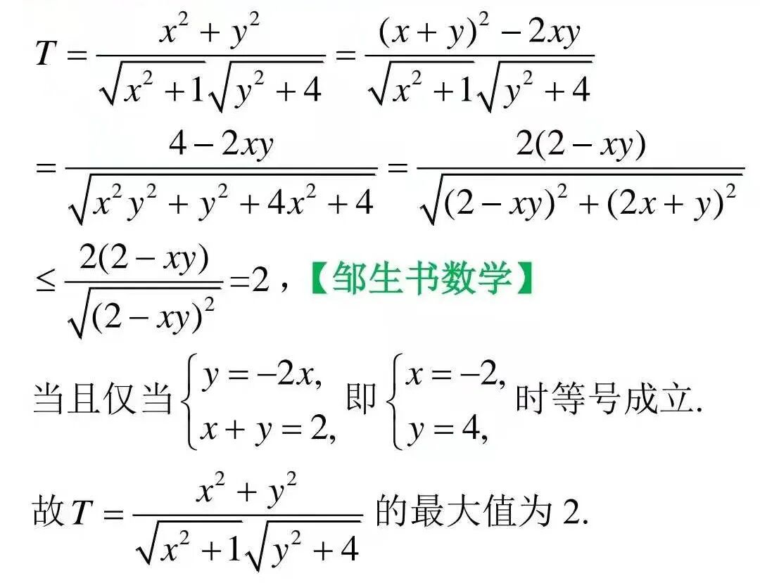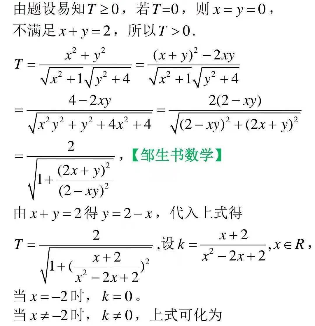 【编者按】这是昨天本公众号推文《林序灿——这个二元最值问题还有其它解法吗?》中的题目。发文前,也就是昨天编者将此题发到两个数学群进行问题征解,很快得到群里朋友的回音,讨论热烈,纷纷发帖交流解法。从交流情况可知,本题最大值求法较多,难点是最小值的求解,结果为根式,运算量大。最大值主要用不等式放缩法和构造向量方法求解,其中不等式放缩法大同小异,但精彩纷呈;惠文旭老师提供的构造向量法可谓联想丰富方法独特,极具创造性,并一箭双雕,结合三角函数同时求出了最小值。洪一平老师综合运用齐次化方法、三角换元和巧配凑辅助角等,一举拿下了最大值和最小值,解法巧妙精彩,令人拍案叫绝。小编用了几个小时整理成文呈现如下,与公众号邹生书数学的广大读者朋友交流分享。