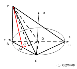 对不在坐标轴上点G处理:因为G为△AOC的垂心,很难求出它的坐标,由OA=OC,所以延长OG交AC于M,则M为AC的中点,且O、P、G、M四点共面,平面OPG即为平面OPM,