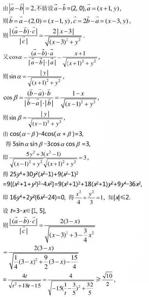 【小结】向量集数与形于一身,是数形结合的良好素材。本题是一道以向量为载体的最值问题,根据向量的数形结合的双重特性,因此解决本题有两条件思路方向,一是充分利用向量的几何特征,将问题转化为几何问题来解决,这种解法往往综合性强,本题综合运用了向量、三角、解析几何等有关知识,对思维能力要求较高;二是根据题意巧设向量坐标,将问题问题转化为向量的坐标运算来处理,实现向量问题代数化,解法干净利落,该解法对化归转化和运算求解能力有相当高的要求。本题是一道考查分析问题和解决问题能力,考查数学综合素质和数学素养的难得好题。佳题共分享,解法相如析。