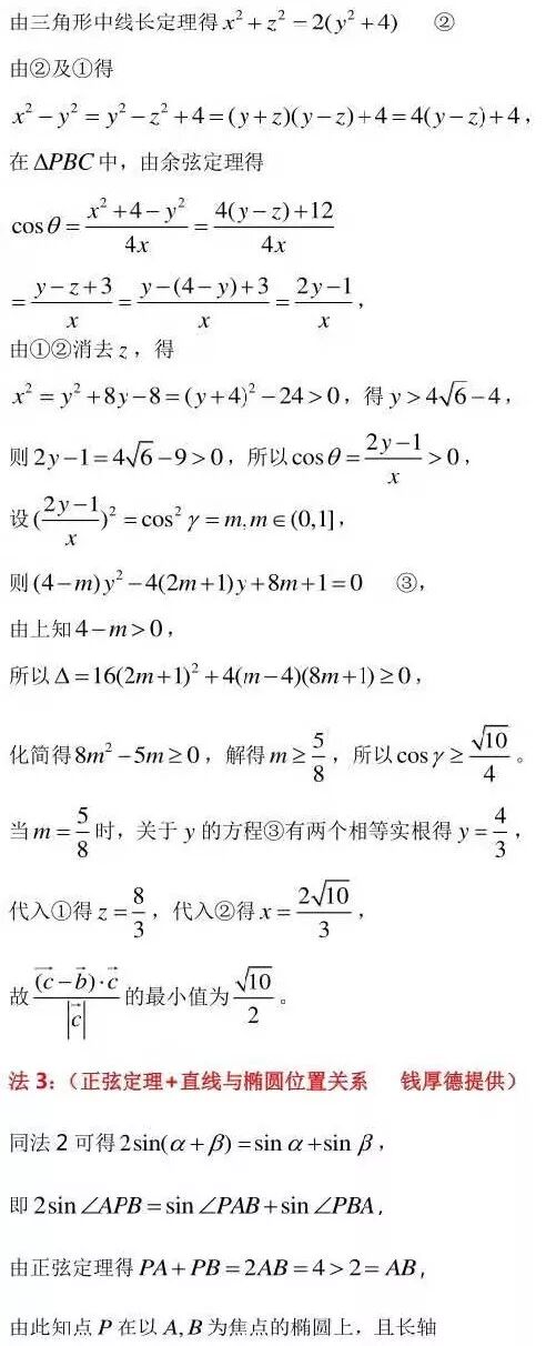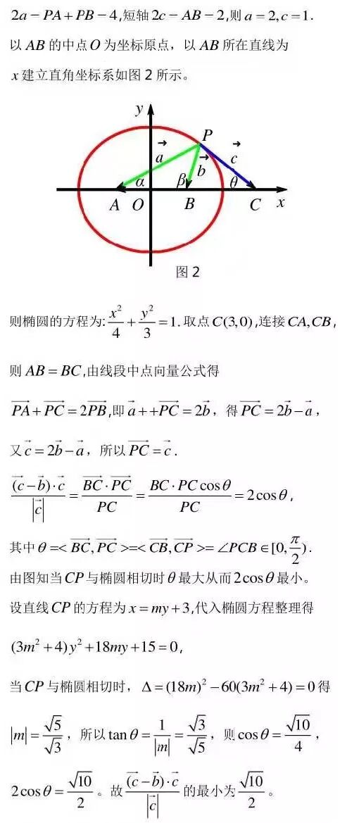 点评:上述三种解法根据向量的有关知识充分利用向量的几何特征,将问题转化为直观的几何图形来解决。三种解法综合性强,综合运用了向量、三角、解析几何等有关知识。三种解法大同小异,法1是将已知三角等式变成余弦形式,然后利用余弦定理求解,解法涉及分类讨论,运算量较大;法2是将已知三角等式变成正弦形式,然后利用正弦定理求解;法3是在法2的基础上挖掘利用正弦定理所得等式PA+PB=4的几何意义,用运动变化的思想让点动起来,构造椭圆,然后用直线与椭圆的位置关系求最小值,解法形象直观。