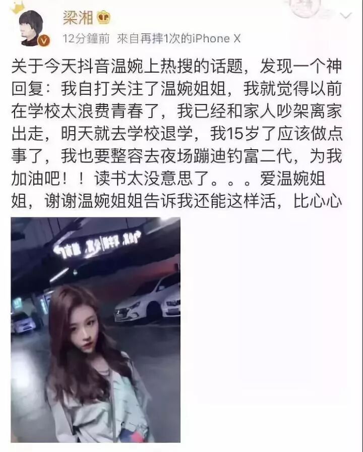 有个孩子看了这位“女神”的视频大彻大悟,说自己以前在学校太浪费青春了,她决定退学去整容,去夜场蹦迪钓富二代!