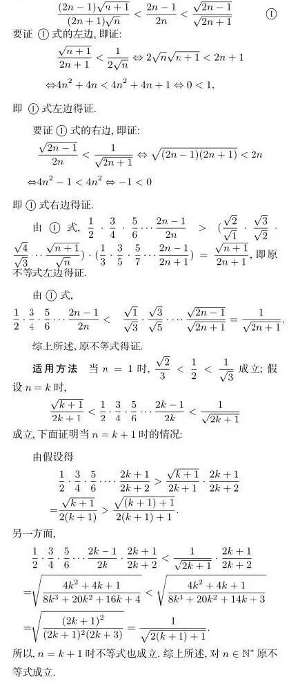 分析 此题是一道双边不等式问题, 无疑放缩法是证明很多不等式的通法, 该题也不例外; 观察要证不等式的结构特点, 联系到数学归纳法的适用范畴: 常用于证明与正整数n 有关的恒等式或不等式, 于是得到其适用方法数学归纳16 中学数学研究2017 年第8 期(上)法; 分析不等式主体的各个因式分子与分母的特点, 通过奇偶变换构造对偶式, 再结合“糖水不等式”可以获得证明原不等式的构造巧法.