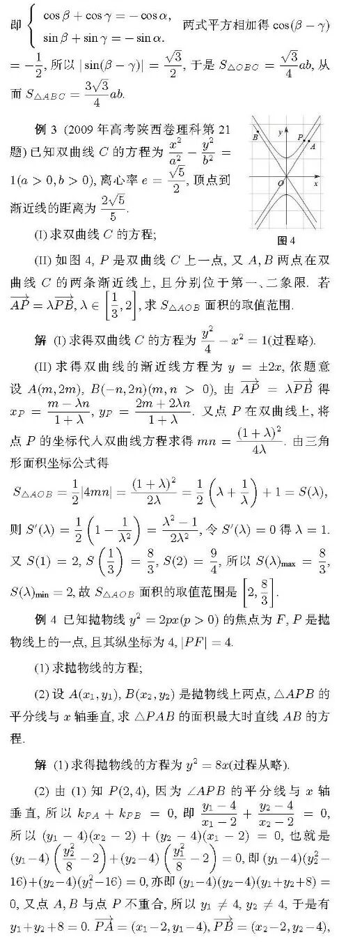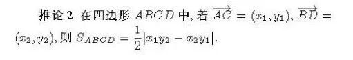 评注 推论1用三角形两边的向量坐标表示三角形面积,形式简洁结构优美,比三角形顶点坐标的三阶行列面积公式应用更为方便快捷。三点共线可以看作是这三点围成平面区域的面积为零,在公式中当三角形面积为零时x1y2-x2y1=0,这恰好是此时A,B,C三点共线的条件。至此,三点共线的充要条件与三角形面积公式和谐统一。由此不仅得出三点共线的又一面积解释,而且还可以用向量共线的充要条件帮助理解和记忆三角形面积的向量坐标公式。