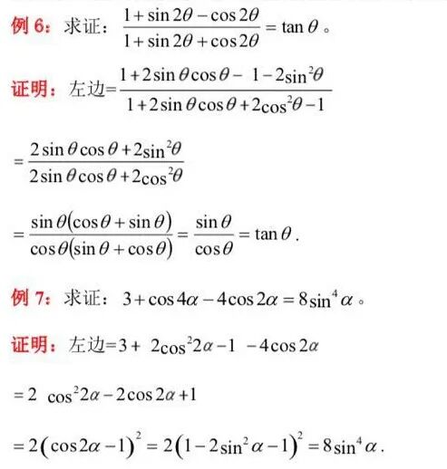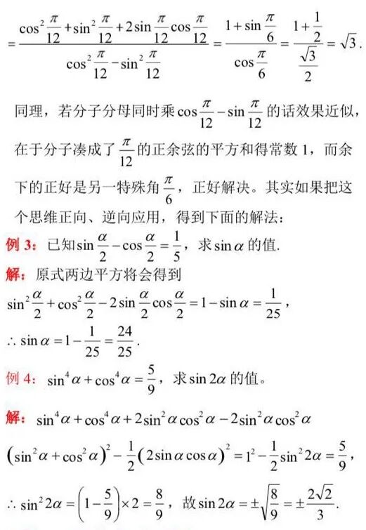 很明显,两个证明从左到右的共同特征是角的缩小,所以证明方向必为“缩角升幂”。众所周知,二倍角的余弦展开缩角有三种变形cos2α=2cos2α-1=1-2sin2α= cos2α-sin2α,但实际中用哪种其实不用彷徨,根据形式的不同,在两例题中分别用不同的变形最快消去常数“1”,达到了化为齐次的效果,或者凑成完全平方公式的形式,为下一步化简铺平道路。
