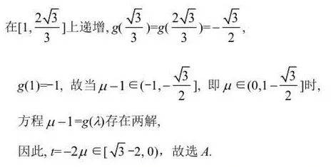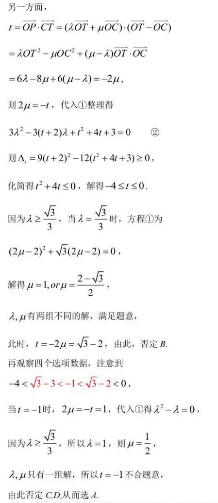 点评:本解法综合运用了直接法和间接法,直接法和间接法是做选择题的最基本最常用的方法。该解法后半部分用到了间接法求解,间接法从题干和选项出发,采用特殊值法对参数进行赋值淘汰错误选项,当淘汰三个选项后,则余下的一项就正确的选项。间接法是做选择题的首选方法,能用间接法就尽量用间接法,间接法往往可以实现小题小做,小题巧做,化难为易,化繁为简,四两拨千斤的解题效果。本解法共进行了两次赋值,第一次是对参数λ赋值,根据条件λ≥√3/3,取特殊值λ=√3/3,从而否定B; 再根据四个选项的数字特征,对参数t进行赋值,取特殊值t=-1,再通过运算推理否定选项C,D.
