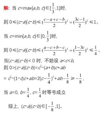 问题:已知a, b, c≥0, 且a+b+c=1, 求(c-a)(c-b)的取值范围。