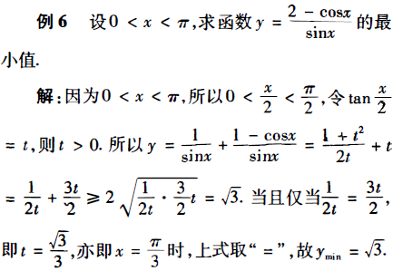 评注:通过有理代换,化无理为有理,化三角为代数,从而化繁为简,化难为易,创造出利用均值不等式的环境。