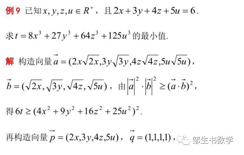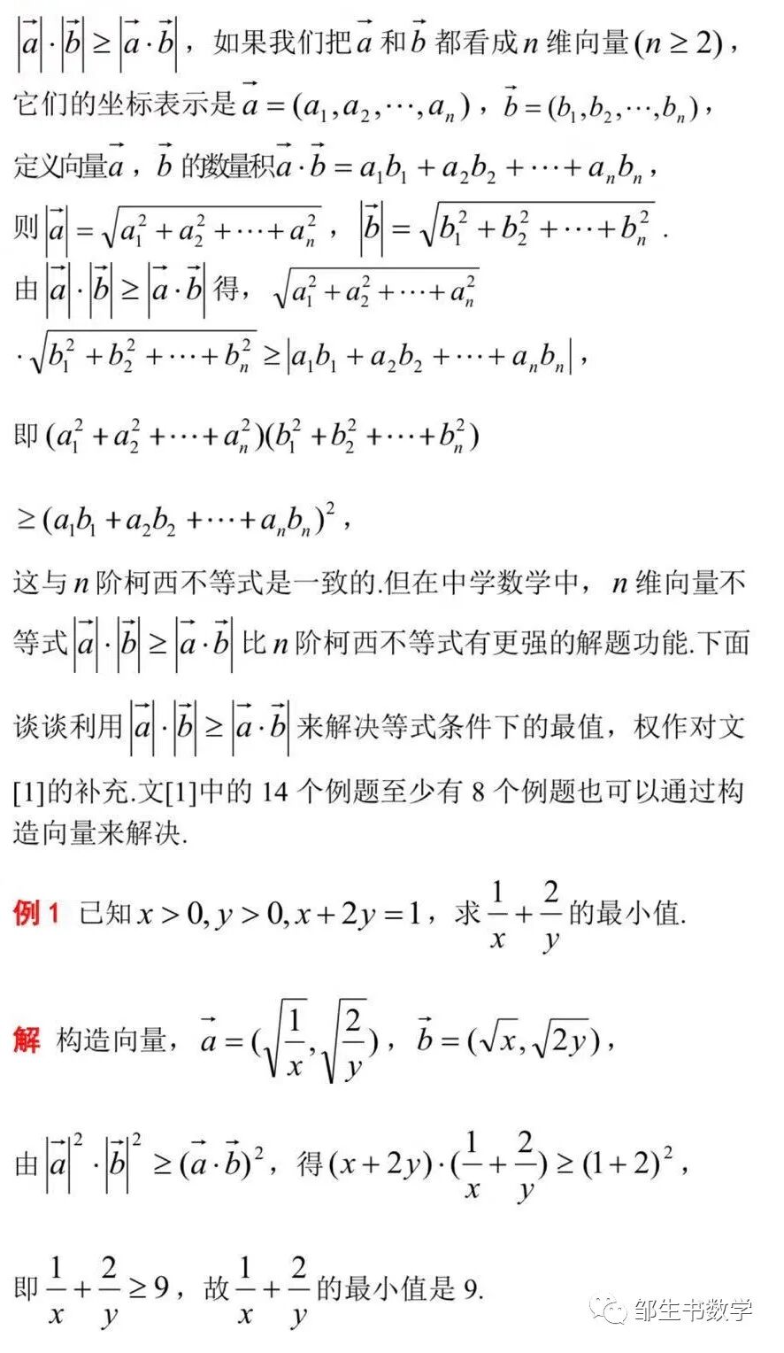 文[1]用7种方法14个例题讨论了等式条件下的最值的求法,笔者读后,启发很大.在IMO、国内外数学竞赛以及一些数学杂志的问题征解中,常常出现一些高难度的等式条件下的最值问题,对于解决这类问题没有统一的方法,任何一种方法都不是万能的,文[1]提供的7种方法只能解决这类问题的一部分.由于向量是现行高中数学教材内容,向量中有重要不等式