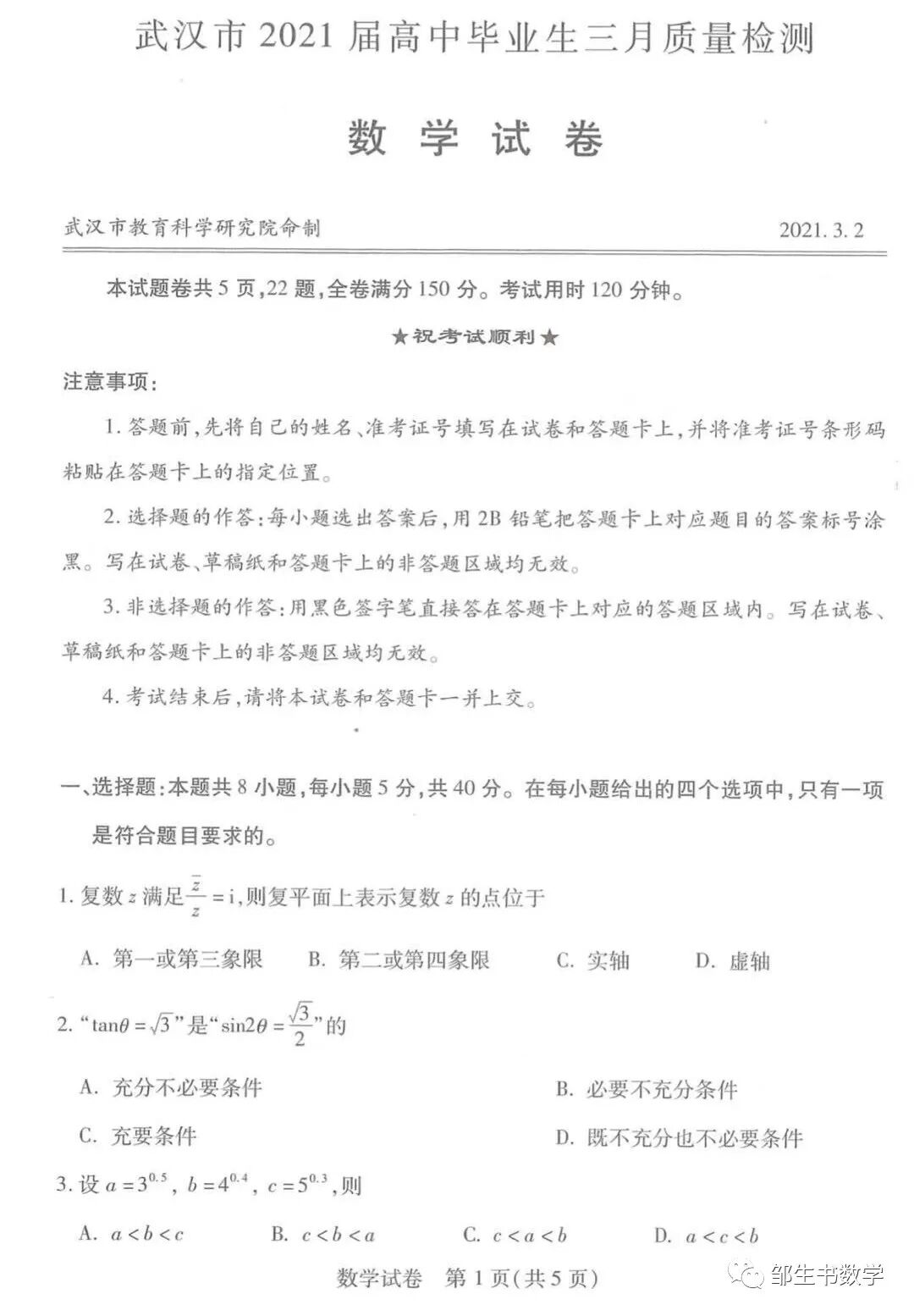 武汉市2021届高中毕业生三月质量检测数学试题与参考答案评分标准