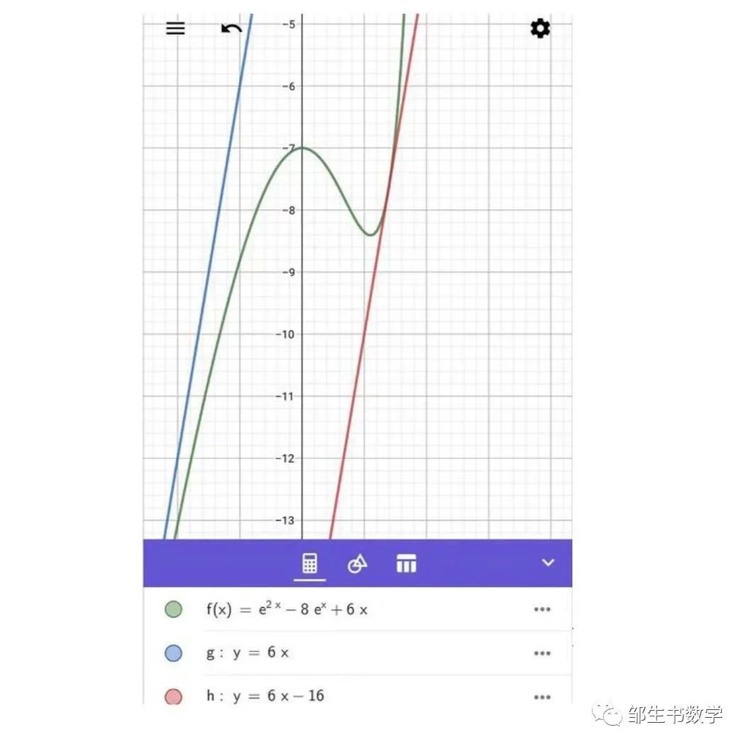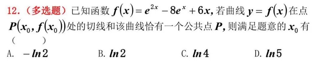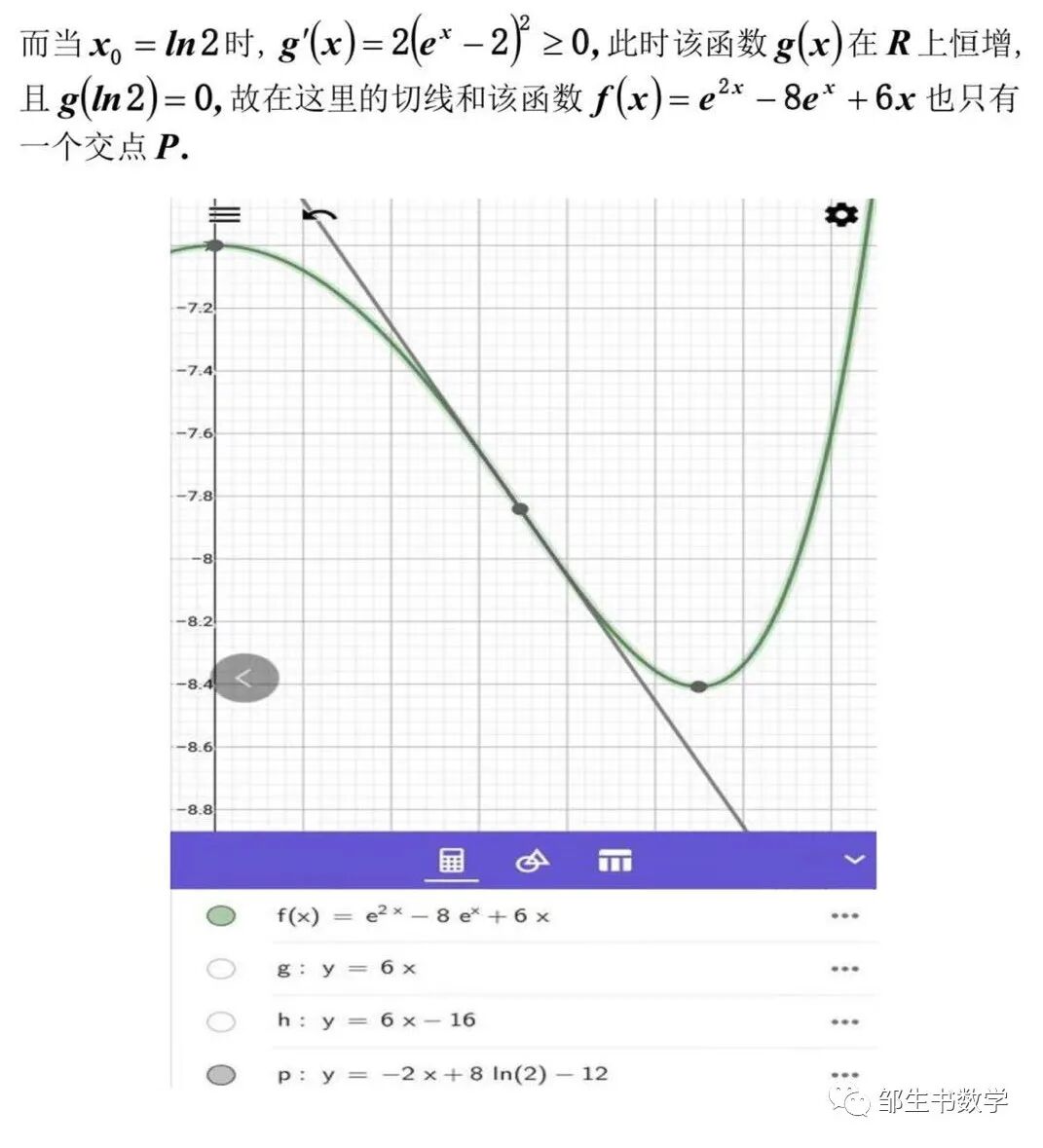 反应快的学生立刻会发现,当x0=ln2和x0>ln4处的切线都和该曲线只有一个交点,但情况是完全不同的。x0=ln2出的切线从图像上观察可知,这条切线穿过了该曲线,但和该曲线确实只有一个交点,为什么会发生这种情况呢?