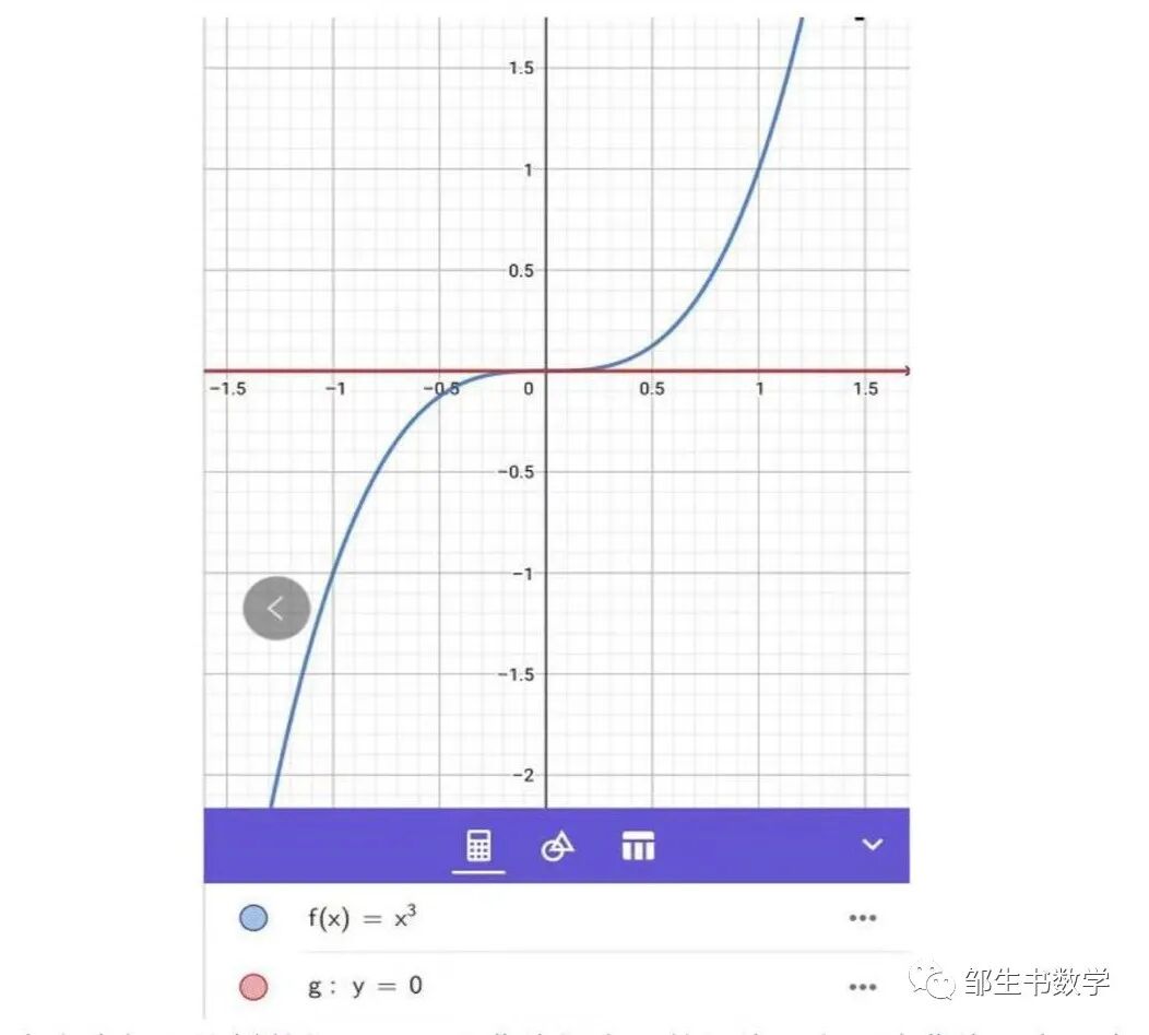 以函数y=x3为例,在O(0,0)处的切线方程为y=0,从图像上可以很容易看出来,这条切线穿过了该三次函数同时和该函数只有一个交点,就是因为原点是该函数的拐点,在原点的左边,该函数是上凸的,而在原点右边,该函数是下凸的,所以在拐点处的切线就具备这种看似反常理的性质,因为我们一般见到的函数的曲线在某处的切线,都是曲线在切线同侧的情况,所以在判断切线的时候要特别注意到这个特例,不能想当然的认为曲线一定在切线的一侧,也有可能在切线的两侧。
