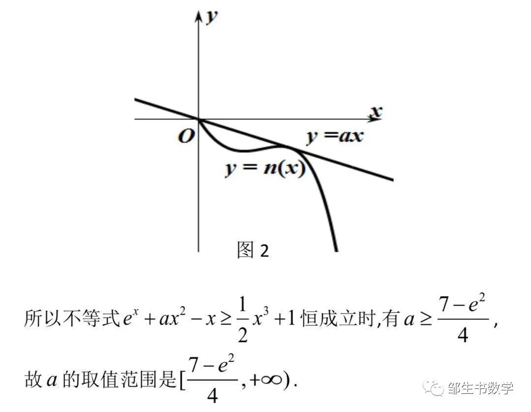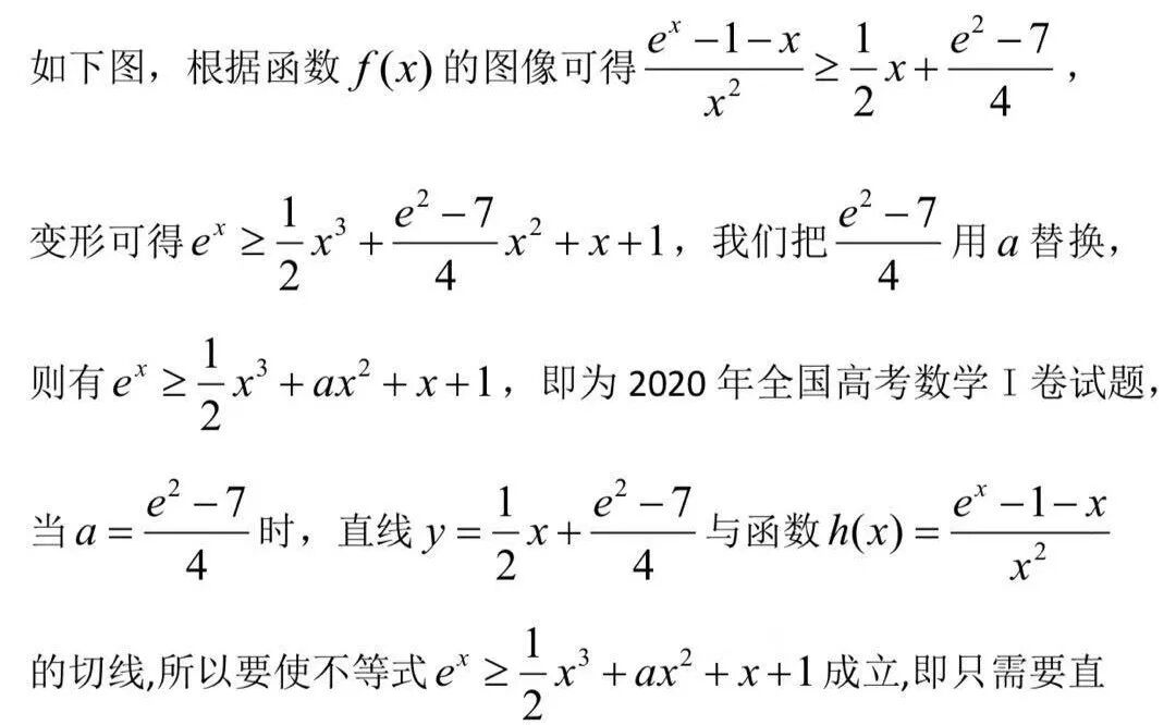 线在函数h(x)图像的下方,如图1,函数h(x)的切线有很多,但是为什么命题人选取了在x=2处的切线呢?那是因为此时的切线方程最为简洁和优美.显然该高考试题有可能是由的泰勒公式改造而来,也有可能是从另外的视角不谋而合,这样形成的题目,对广大考生来说,在“题海”中找不到它的踪迹,传统的押题教学,刷题教学就显得苍白无力,这就是教学要走出“题海战术”的原因之一,泰勒公式是高等数学中的内容,高中生没有学习,命题人既然把它改造为高考试题,那么一定可以用初等的方法去求解,这也高考数学压轴试题中总有高等数学的影子的原因之一.