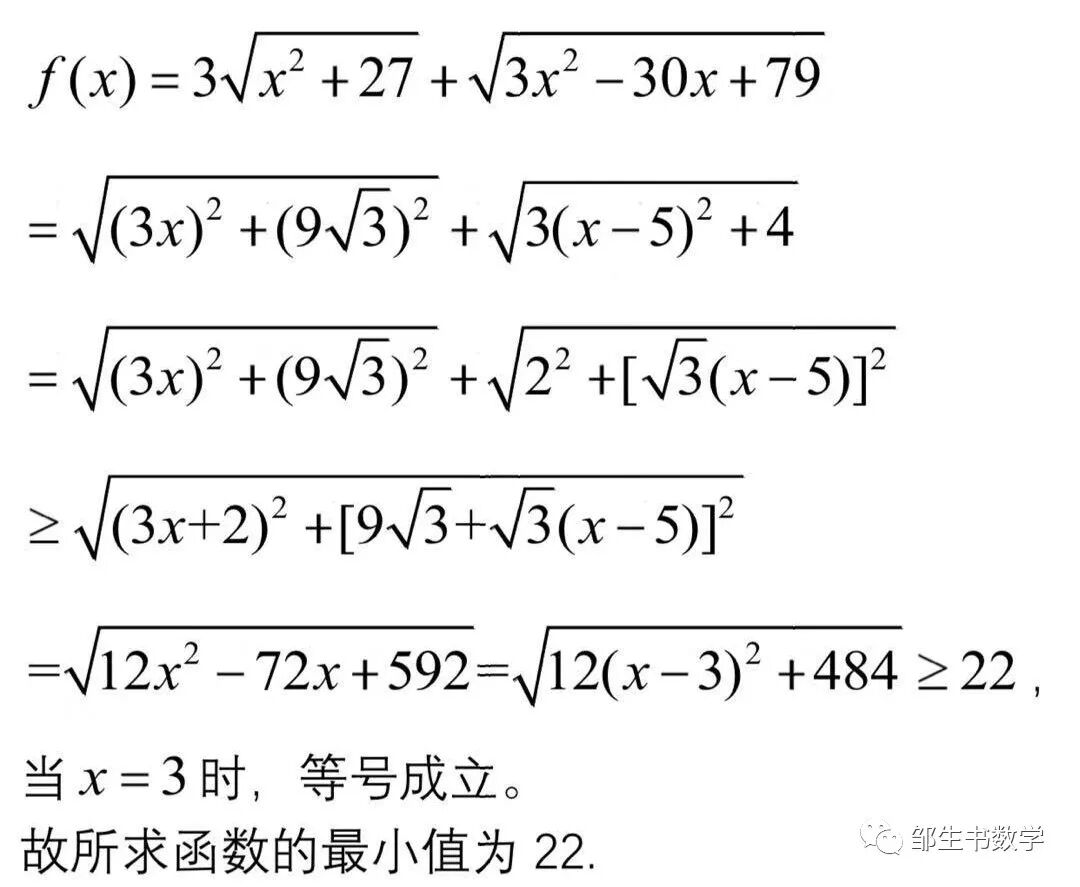 后一个不等式等号成立的条件是x=3,故当x=3时,所求函数取得最小值为22.