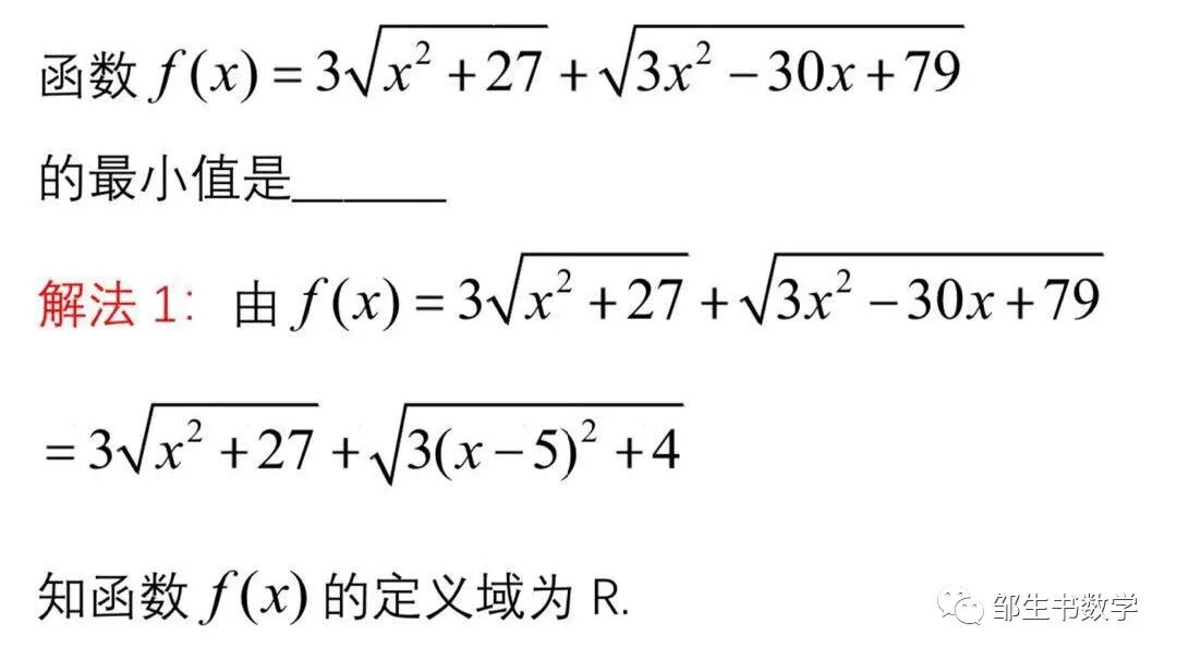 点评:本题若用暴力解方程求极小值点会出现高次方程运算量较大,过程较繁琐,本解法先圈定极小值点的范围是(-2,2),再考虑极值点是否为整数,而在(-2,2)这个范围内的整数只有-1,0,1三个,从零开始进行验算,真是无巧不成书,一算便知0就是导函数的零点,即为原函数的极值点,根据题意f(0)=3√5就是所求的最小值。