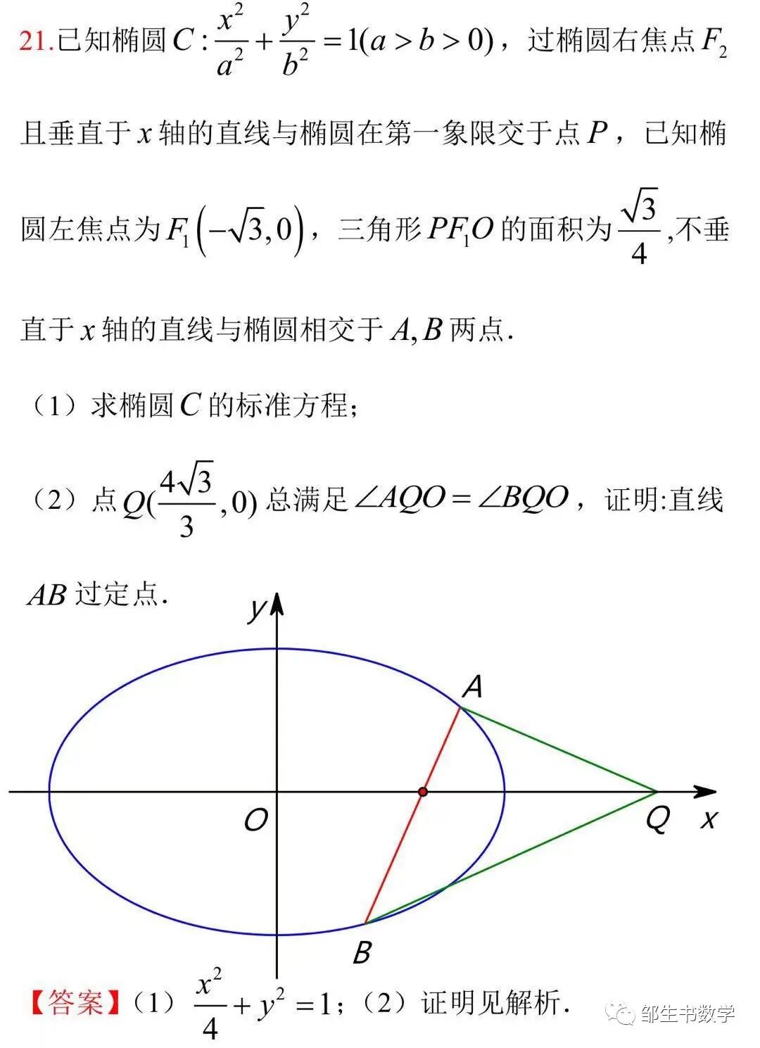 金太阳好教育数学押题卷一的第21题,是一道以椭圆为载体圆锥曲线等角定理为背景的直线过定点试题,题目及参考答案如下: