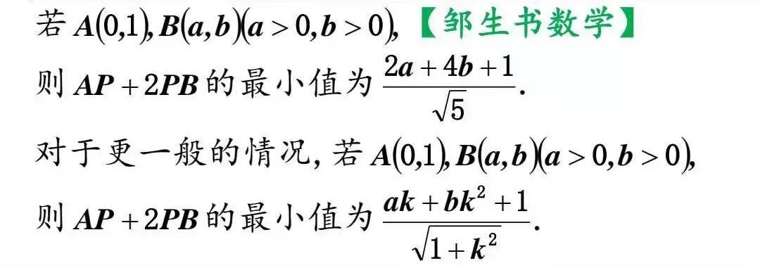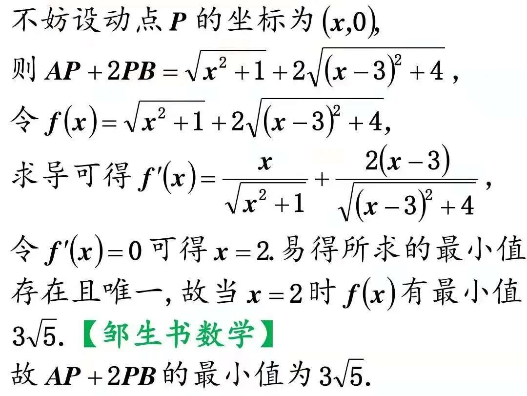 解析:这类AP+kPB结构的式子,就是所谓的加权的将军饮马问题,之前的解法普遍是以解方程为主流的解法,当其中一个点的坐标一换的时候,很容易对应的方程很难得到比较好的解,所以一般只给学生做情况比较简单的情况。