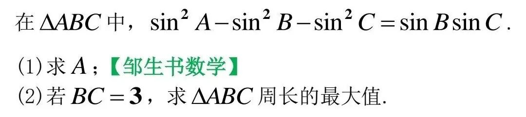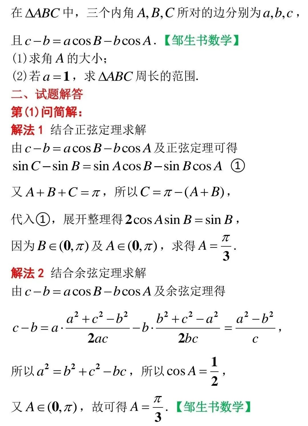 评注:第(1)问先用正弦定理将角的正弦转化为边的关系,再利用余弦定理及三角形中角的范围即可求出角;第(2)问以上四种方法均可求解,而且该高考试题只需求周长的最大值,所以求解更简单.