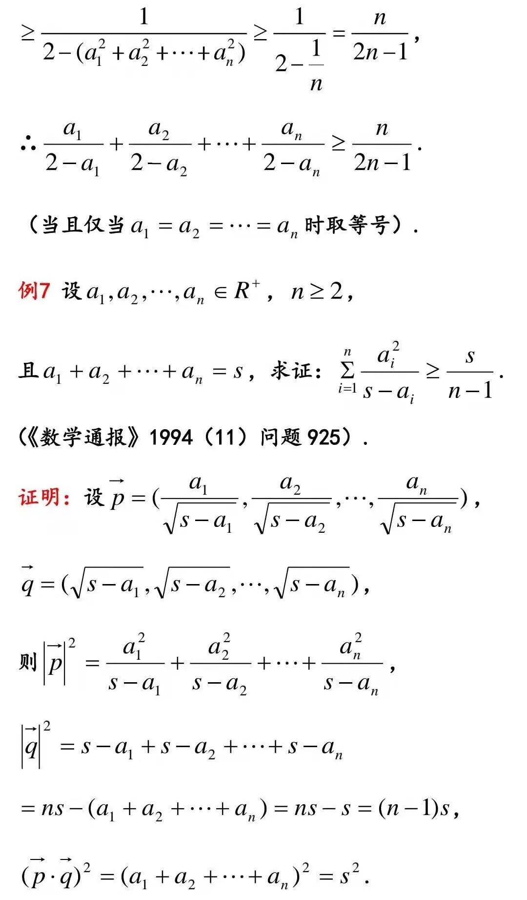 综上所述,我们不难发现,构造向量证明文[1]所给出的不等式优于逆用等比数列各项和来证明.文[1]只给出了例1至例5的证明,其余5个例题没有给出证明.在构造向量时,有时要将要证的不等式进行等价变形后再来构造向量.上述10个例题分为两种类型:如例1、例4、例5、例7、例9、例10属于的形式,它们构造向量的方式相同;例2、例3、例6、例8属于