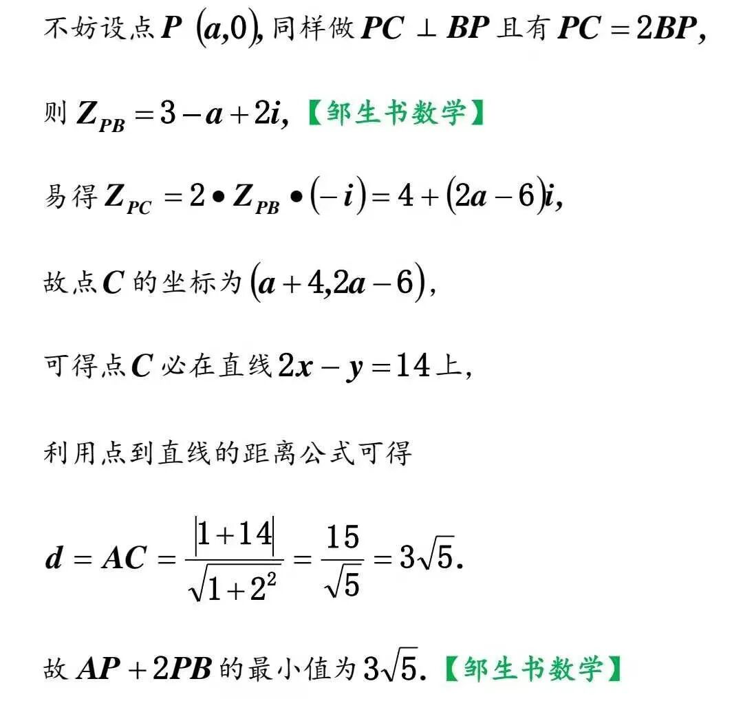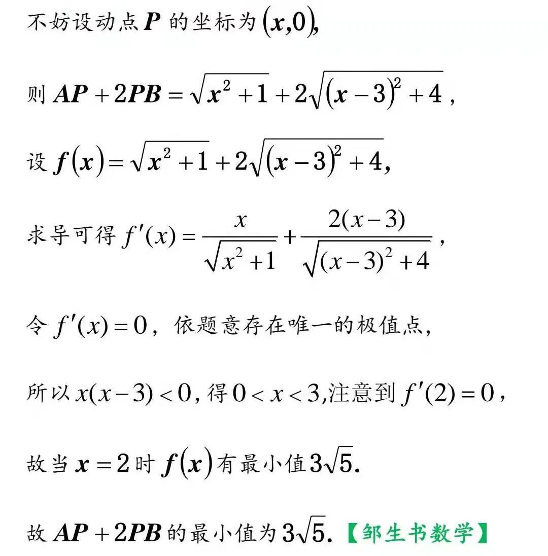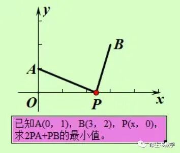 解析:这类PA+kPB结构的式子,就是所谓的加权的将军饮马问题,之前的解法普遍是以解方程为主流的解法,当其中一个点的坐标一换的时候,很容易对应的方程很难得到比较好的解,所以一般只给学生做情况比较简单的情况。