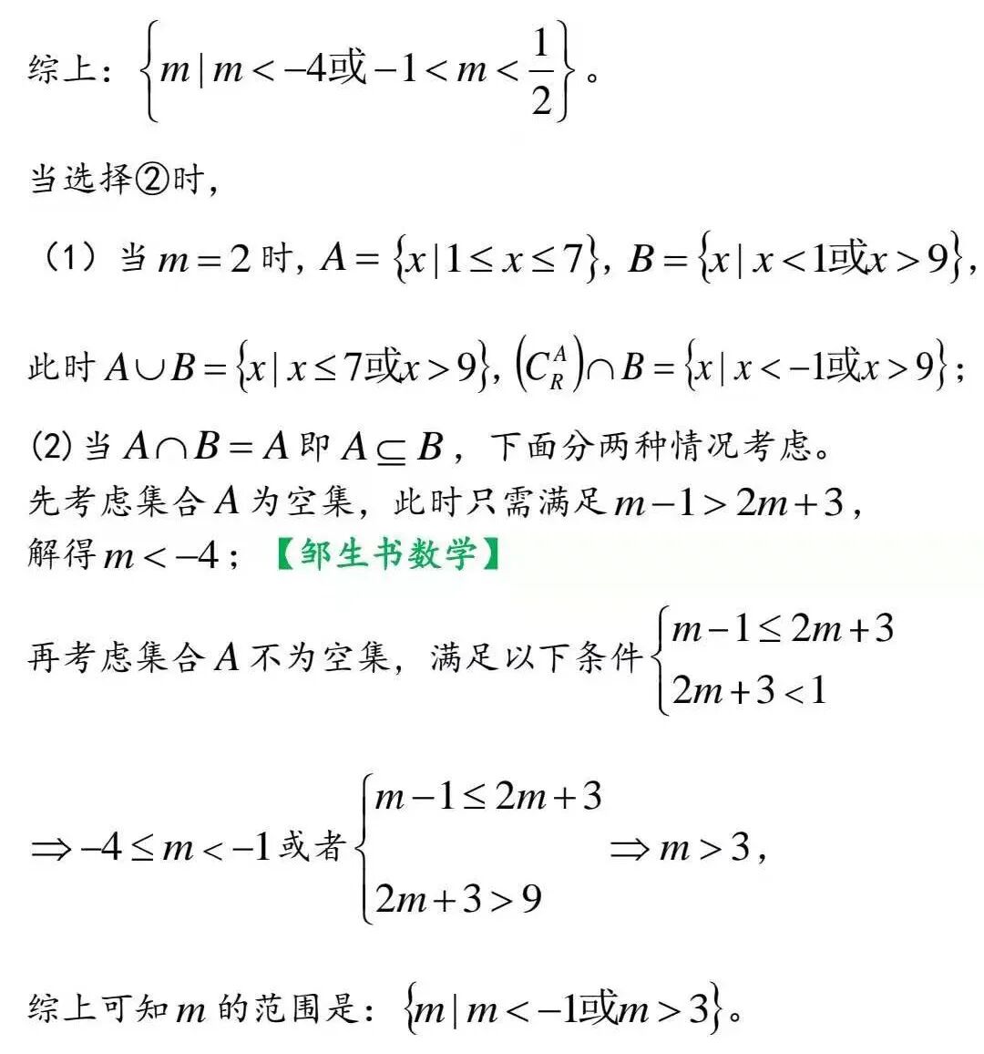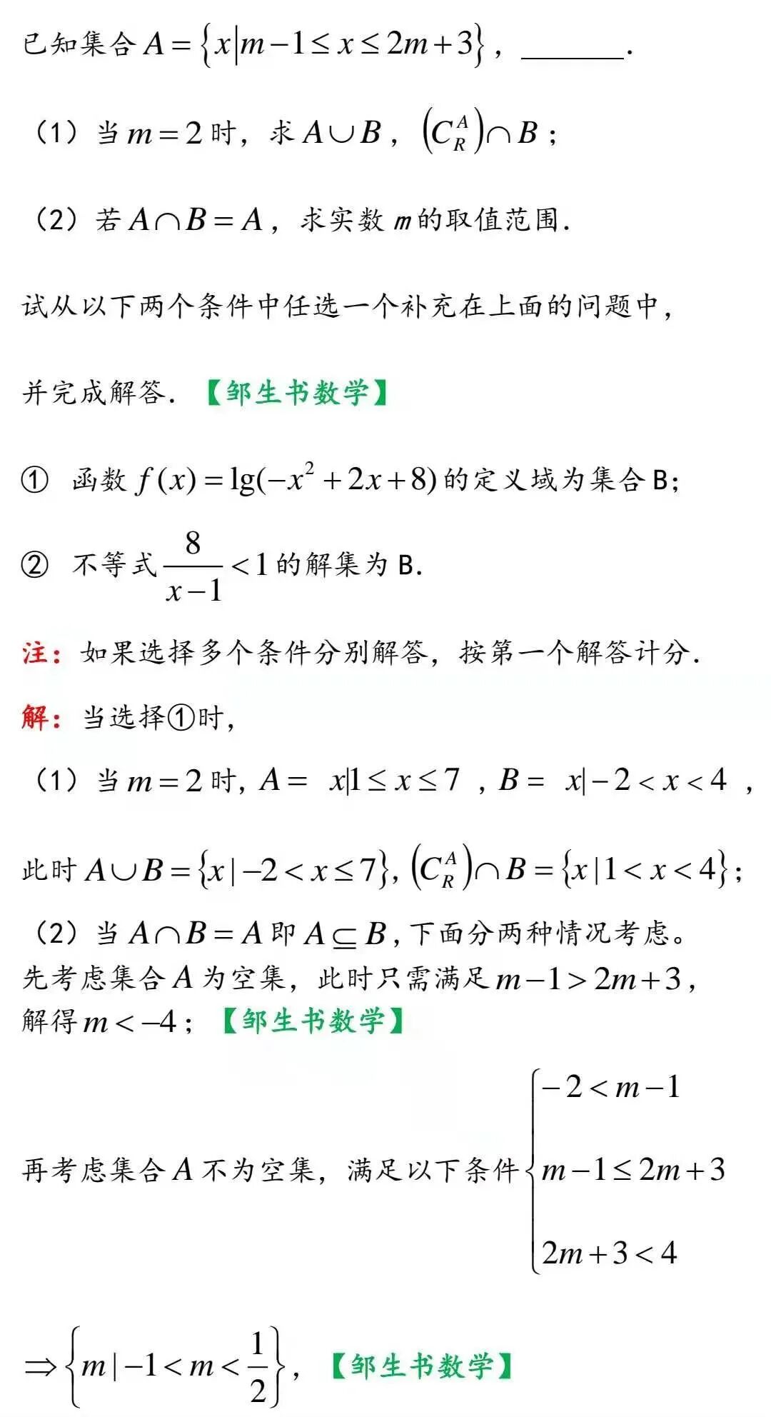评注:该试题以集合间的基本关系为载体,考查集合间的基本运算。选择任意一个情况进行解答都可以保证试题结构的完整性,而且两种答案难度基本相同,保证了测试的相对公平性。该题设计时有意的引入了空集的讨论,给原本有些枯燥的试题增添了一些分类讨论的思想,给人带来美的享受,也对学生的素养和能力进行了分层考查,体现试题的区分度,有助于客观评价学生的水平。