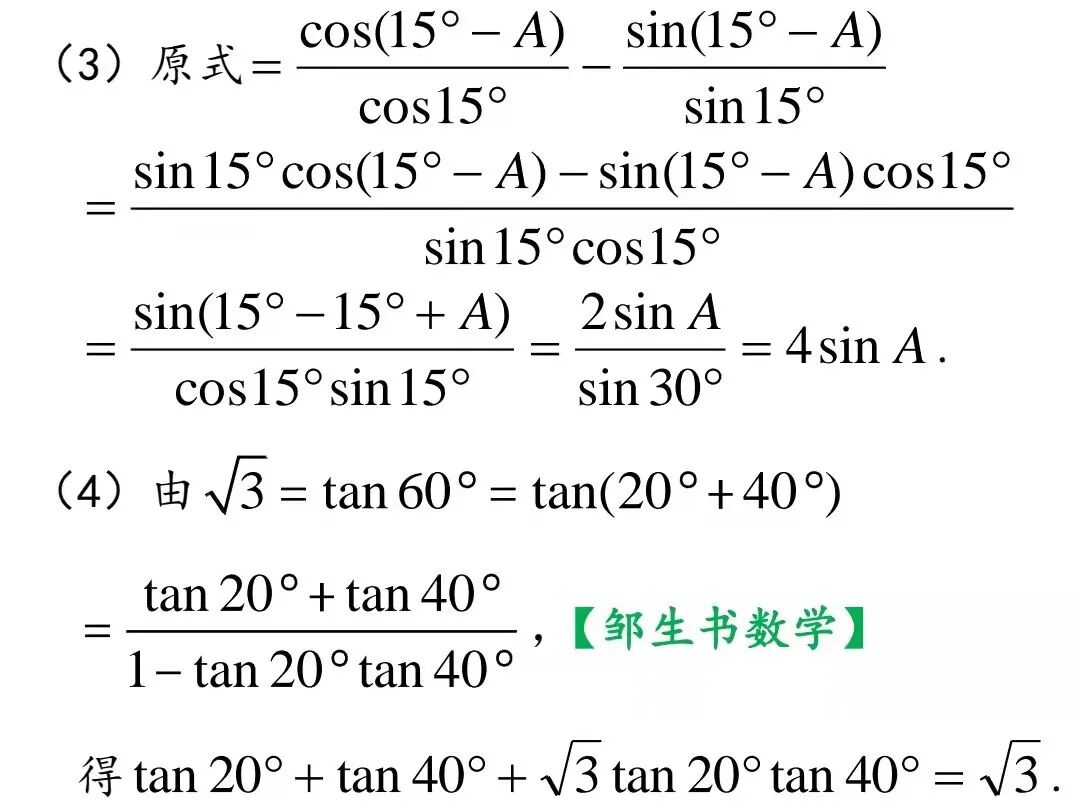 通过以上4题讲解,对一些隐用三角公式的解答题,学生能准确迅速地发现其中的规律,使之适用于某个三角公式进行运算,从而达到培养学生创造性思维能力的目的.