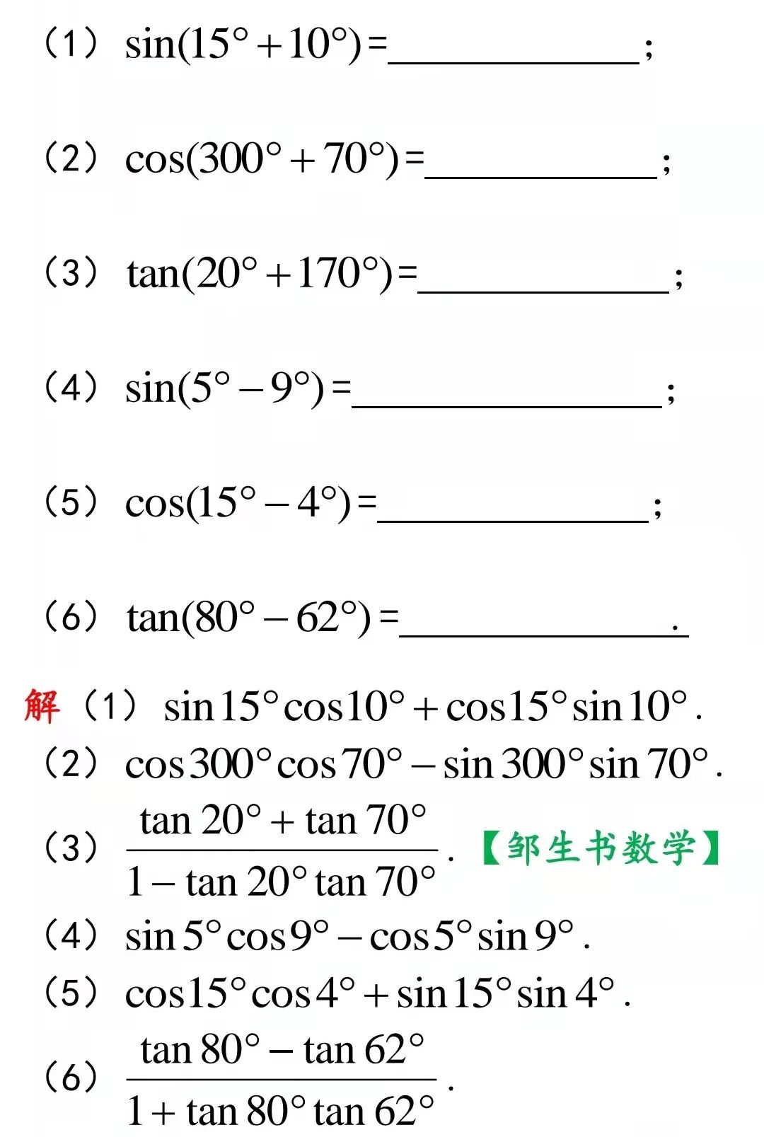 模仿是类比的基础,当模仿能力上升到一定层次后,其类比思维能力也将得到增强.在探求并证明了三角公式后,首先要求学生能模仿公式进行简单应用,为此举6例.