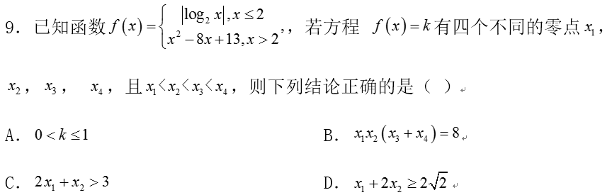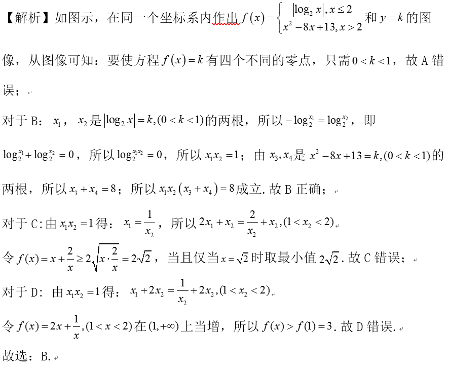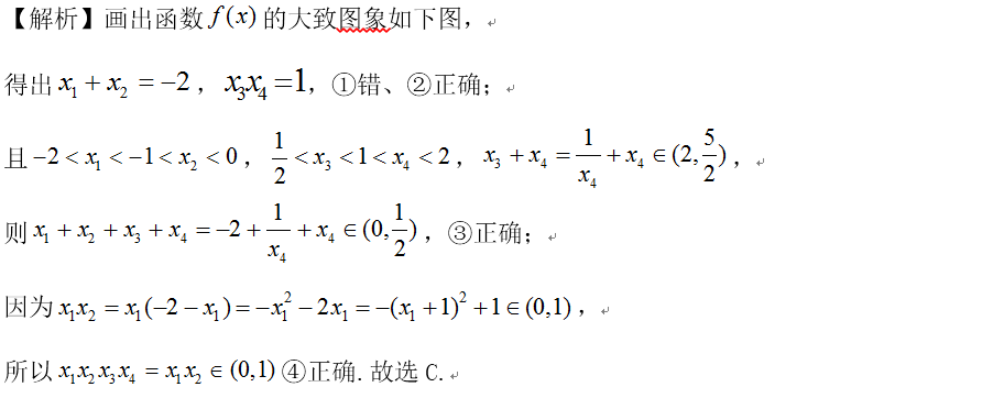 点睛:作出函数图像,由数形结合,根据对称性及对数函数性质,求得各交点间的关系,转化为一个变量,从而求得范围.