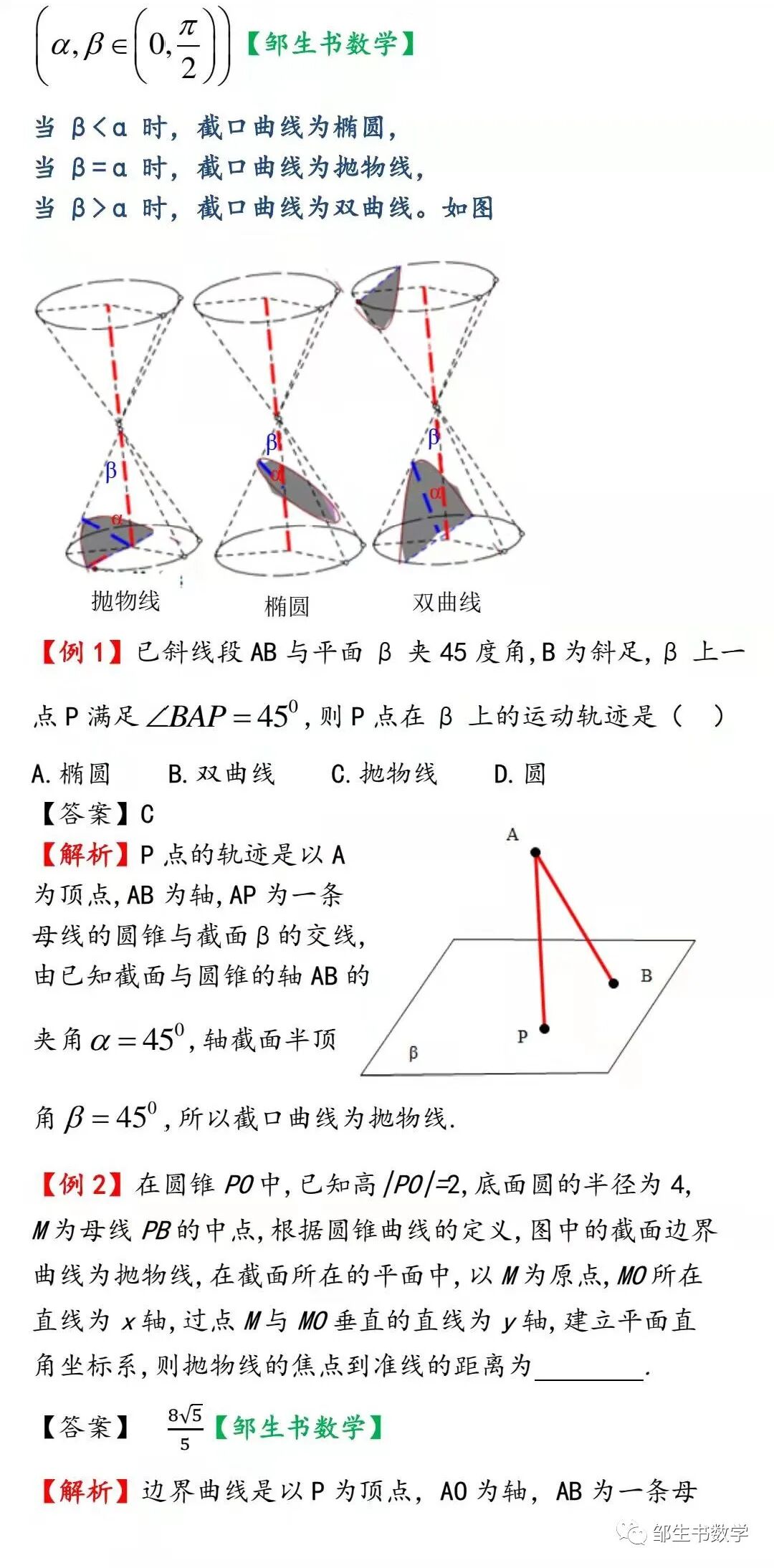 圆锥曲线的几何意义建立了立体几何与解析几何的联系。以上问题解法可总结为“一轴一母线一截面,两角大小作判断”。先确定圆锥的顶点、轴和一条母线,以及截面,再求轴截面半顶角β和截面与圆锥的轴的夹角α的大小,然后判断截口曲线的形状。