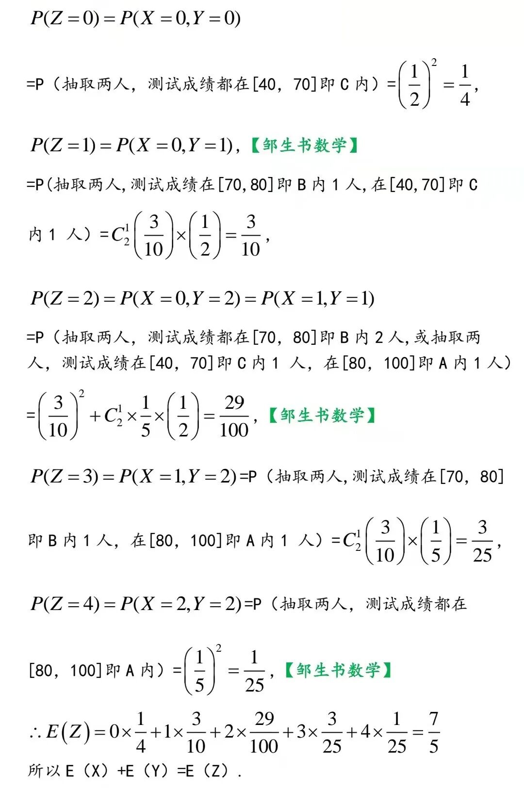 (2)用样本频率估计总体,从全市高中学生中随机抽取2名学生,记成绩在区间[80,100]内的人数为X,成绩在区间[70,100]内的人数为Y,记Z=X+Y,比较E(X)+E(Y)和E(Z)的大小关系。