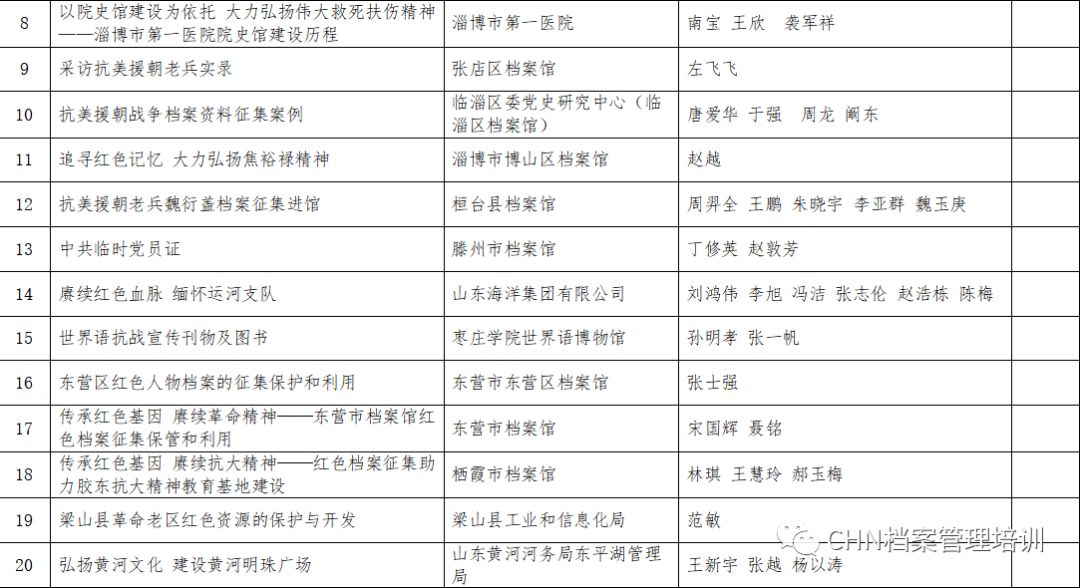 根据《山东省档案馆关于开展红色档案征集优秀案例评选活动的通知》要求,经各单位申报,省档案馆红色档案征集优秀案例评选领导小组办公室组织专家评审,报馆务会研究,确定示范案例35项、创新案例47项、优秀案例55项。拟评选淄博市档案馆、枣庄市档案馆、临沂市档案馆、菏泽市档案馆、博山区档案馆、山东能源集团有限公司、国网山东省电力公司、中国人民银行济南分行等8家单位为优秀组织单位。现予以公示。