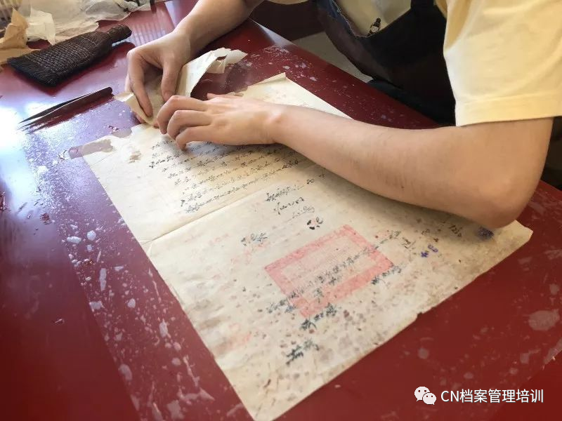 2在托纸上用浆糊后,置于吸潮纸上撤潮,待托纸半干后,再将托纸浆面向下搭覆在反铺的档案上(应由二人合作),边放边用棕刷刷平。然后将垫膜连同文件一起揭起来,反放在吸潮纸上,仔细揭下垫膜;