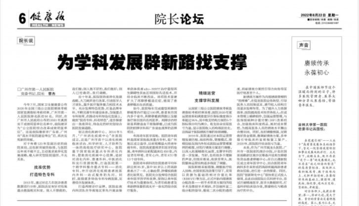 今年7月,国家卫生健康委公布2020年全国三级公立医院绩效考核国家监测指标考核结果,广州市第一人民医院排名跃进56名。同时,在广州市人民政府公布的2021年真抓实干成效明显单位名单中,广州市第一人民医院被评为“公立医院综合改革成效明显单位”。这是广州市第一人民医院继获评广东省、广州市“高水平医院建设单位”后,再次实现新的突破。