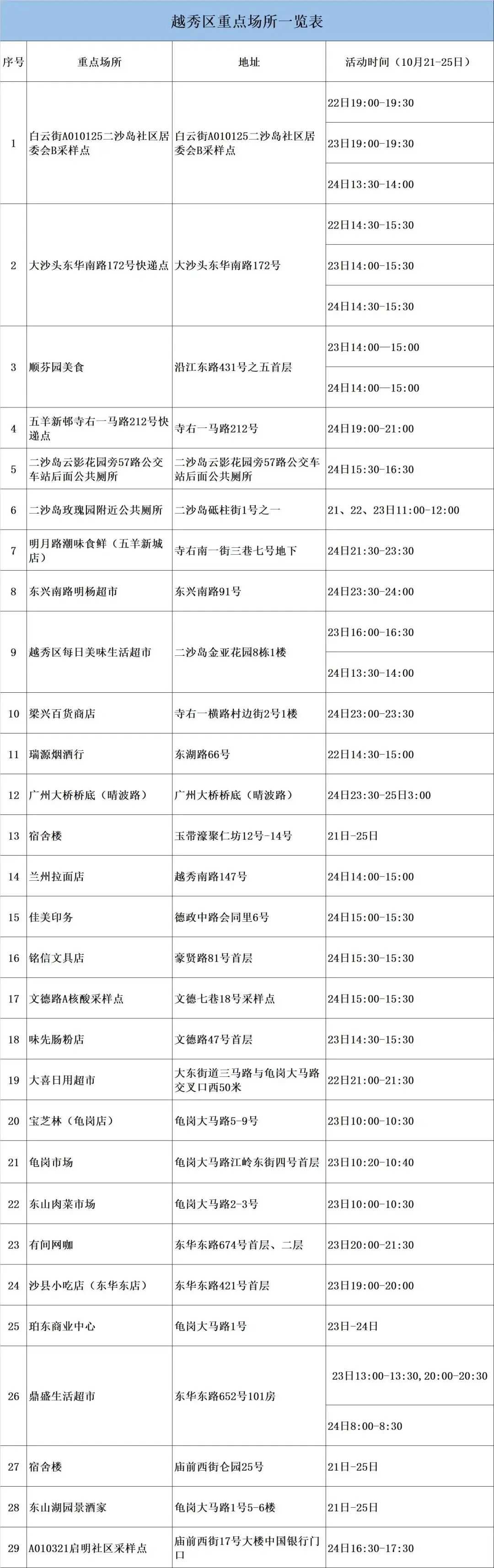 因新冠疫情防控需要,请在相关时段到过越秀区下述重点场所的人员,立即向所在社区联系报备,严格落实“3天3检”,并配合做好疫情防控各项措施。若不如实申报,不落实防控措施,造成严重后果的,将承担相应法律责任。