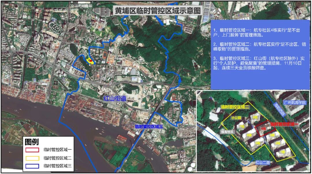 11月10日,黄埔区红山街道在重点人群筛查中发现1例核酸检测异常人员。根据疫情防控需要,经区新型冠状病毒肺炎疫情防控指挥部研究决定,自2022年11月10日上午10时起对红山街道部分区域实施临时管控: