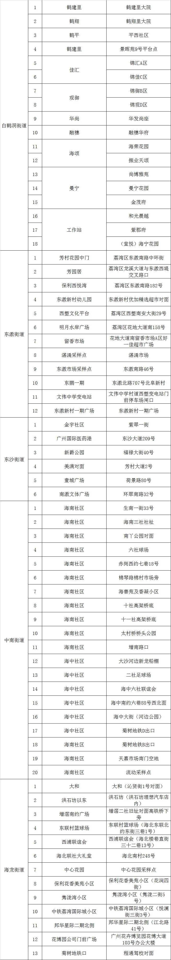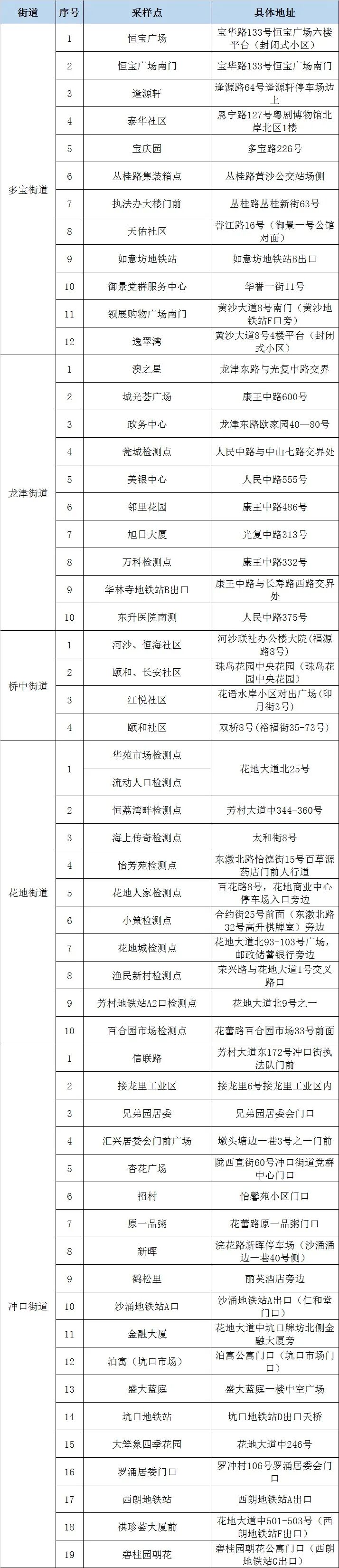根据最新疫情防控形势,为切实保障广大市民生命安全和身体健康,2022年11月27日(星期日)8时开始,多宝、龙津、桥中、花地、冲口、白鹤洞、东漖、东沙、中南、海龙等10条街道开展核酸检测“应检尽检”工作,请以上10条街道的市民朋友(含外来人员)到就近的采样点(详见附表)进行1次核酸检测。有关注意事项如下: