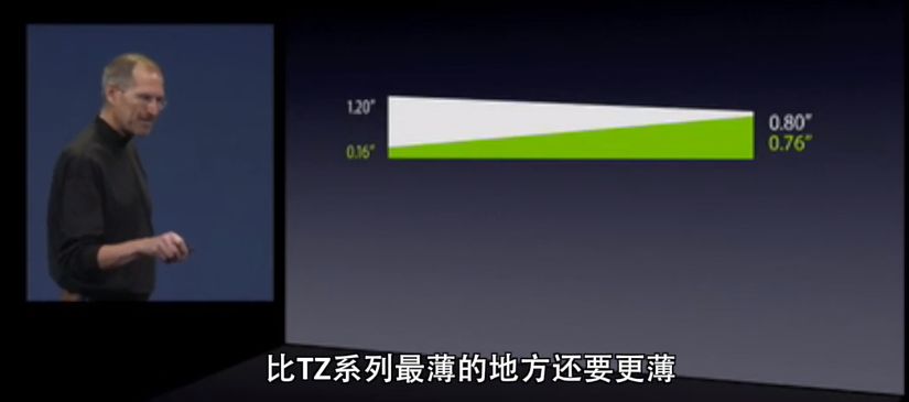 当时市面上最薄的笔记本是索尼TZ Series,而Macbook Air最厚部分,比它的最薄部分还要薄。